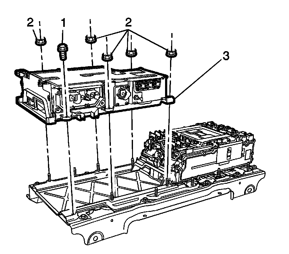 2. Install the generator control module (3) to the support tray studs. Tighten the fastener (1) to 9 Nm (80 lb in).