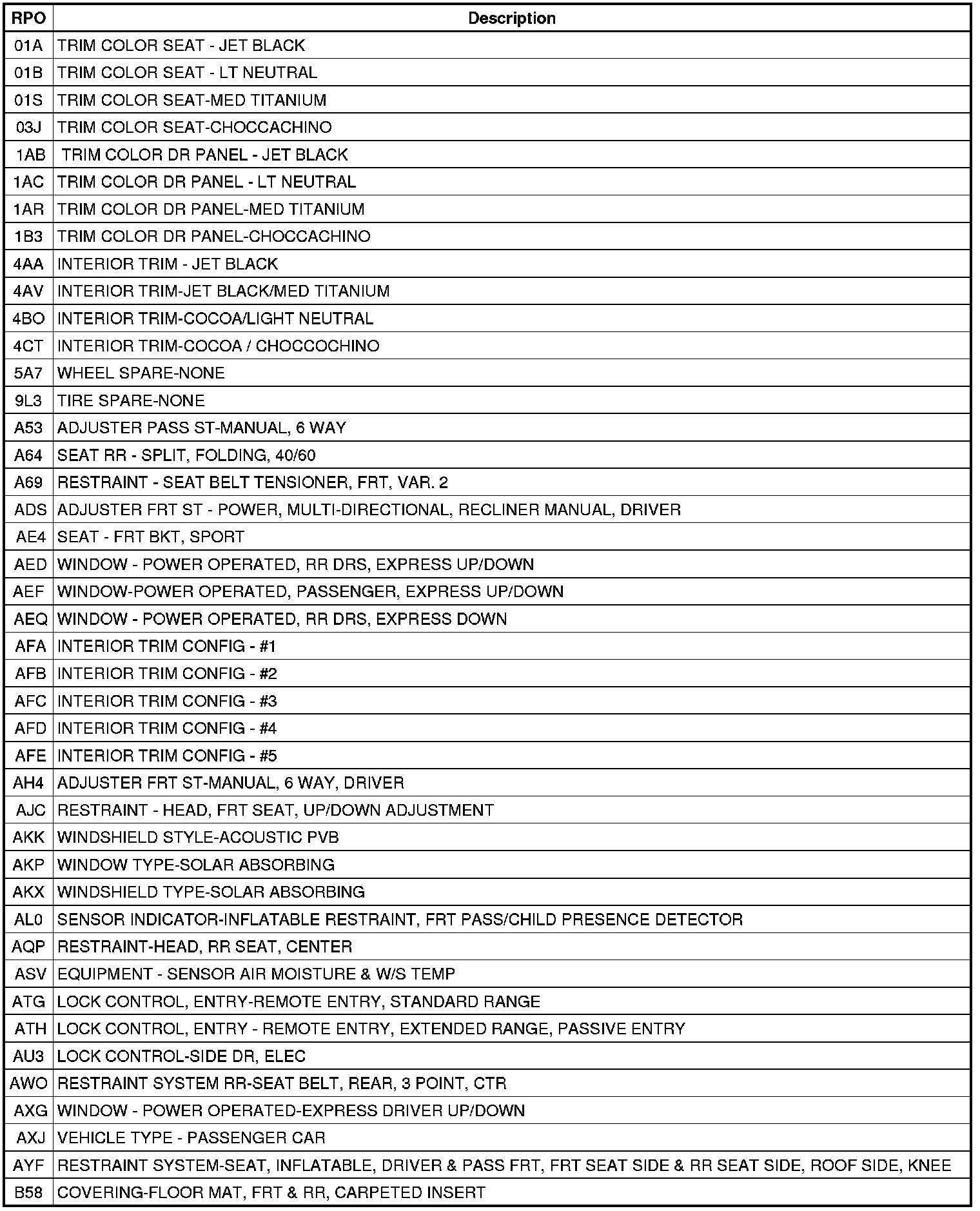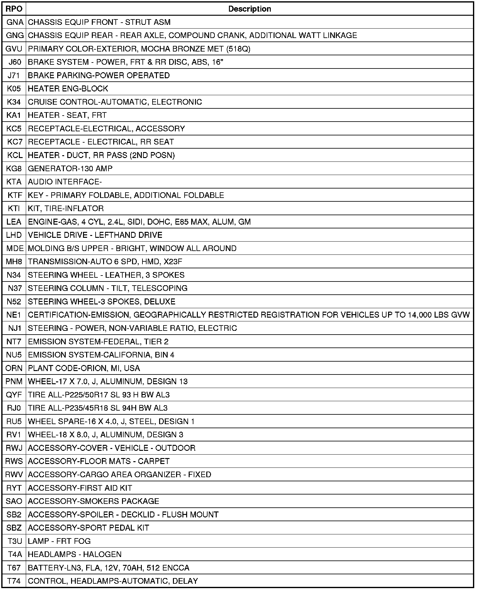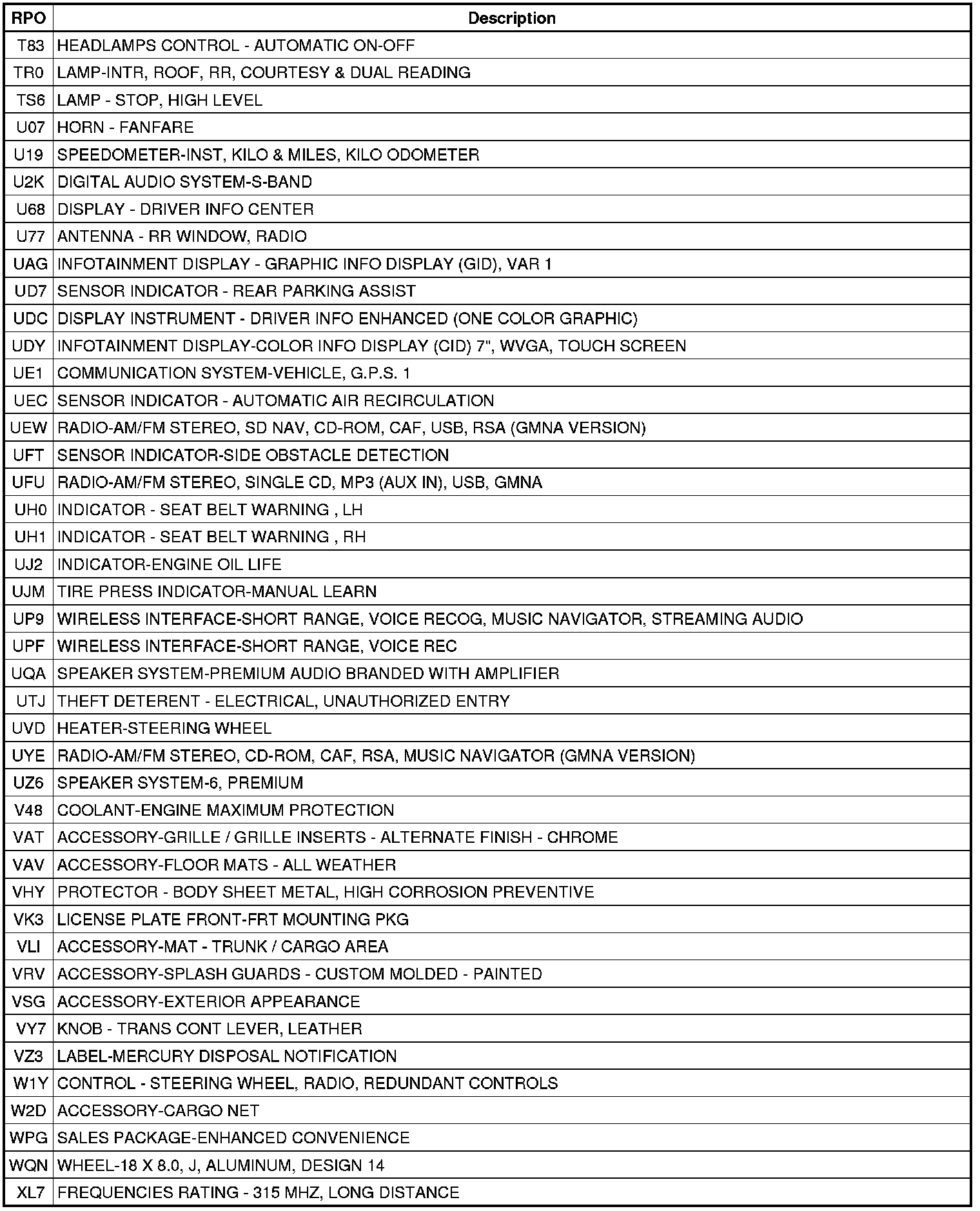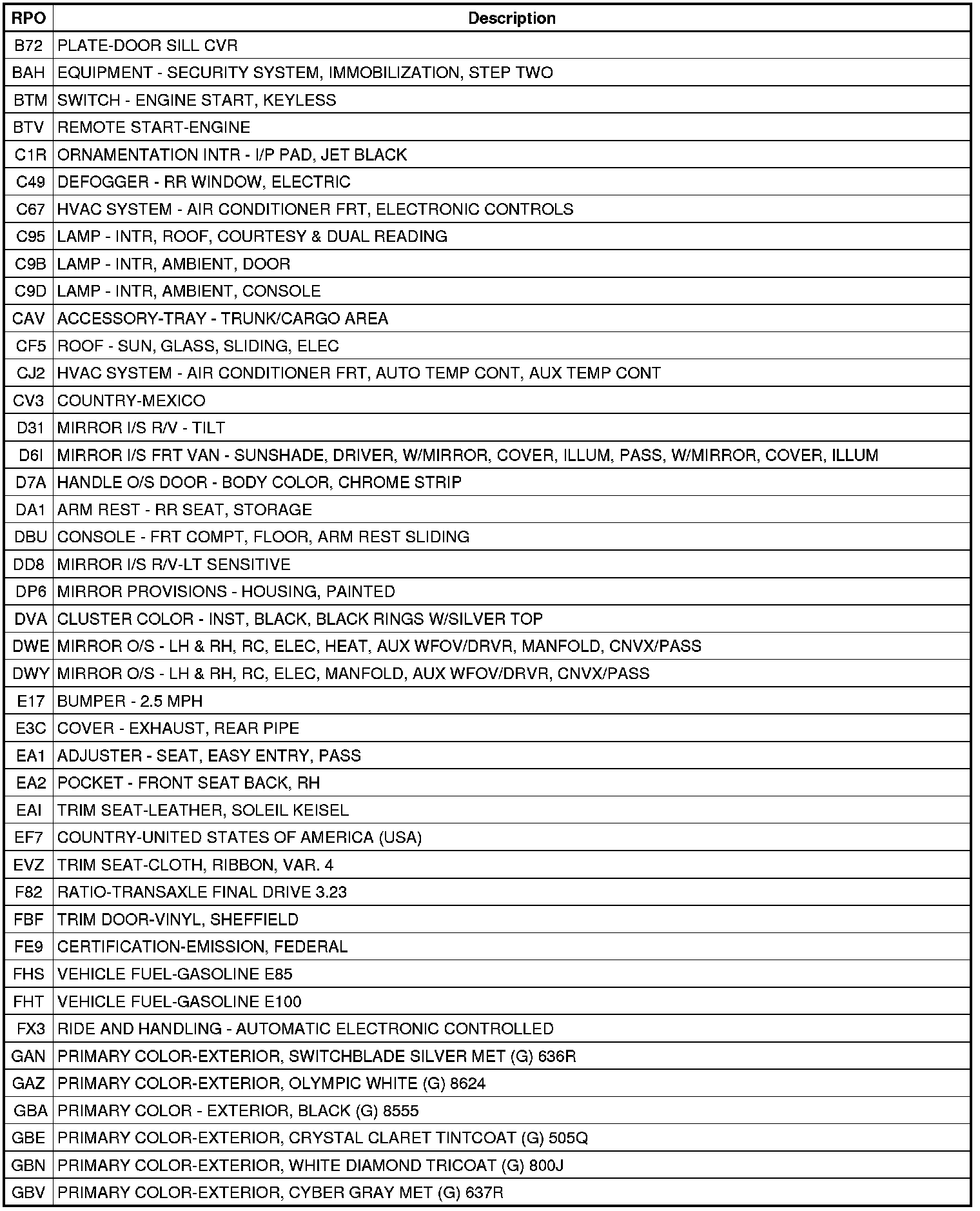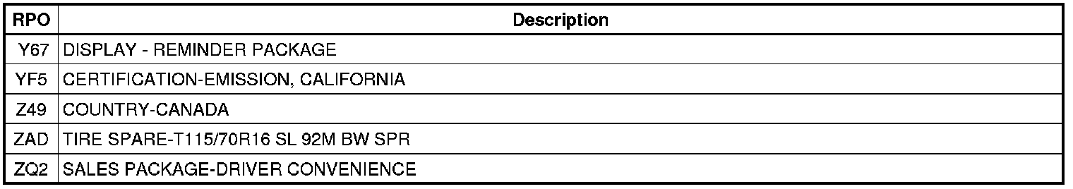 The following table provides the description of the Regular Production Option (RPO) codes that are available on the vehicle. The vehicle's RPO list is printed on the Service Parts Identification Label.