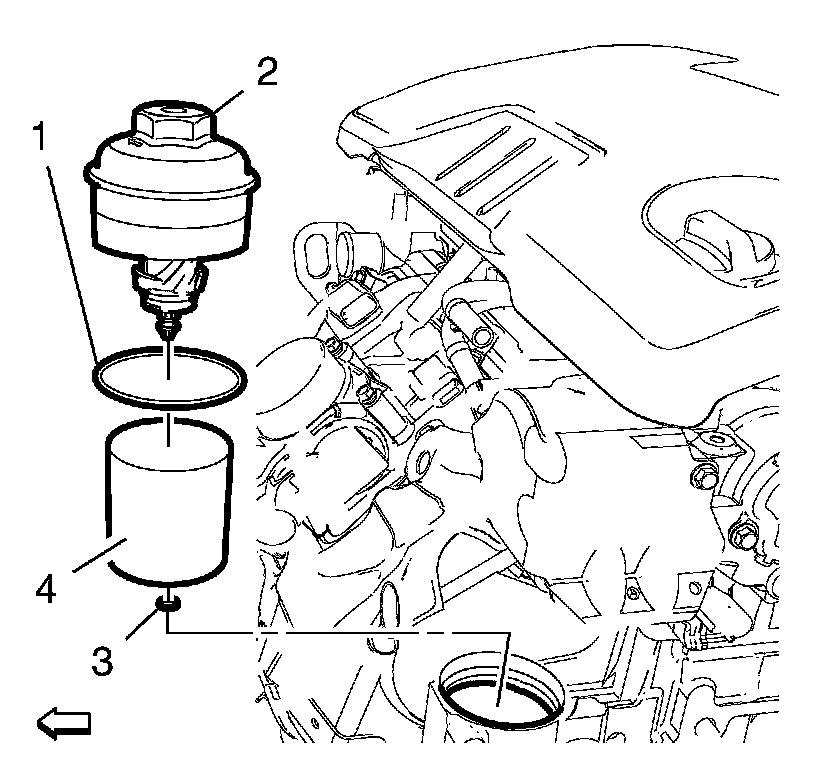 Note: Install a NEW oil filter (4) and a NEW oil filter cap seal (1) and (3) to the oil filter cap (2).