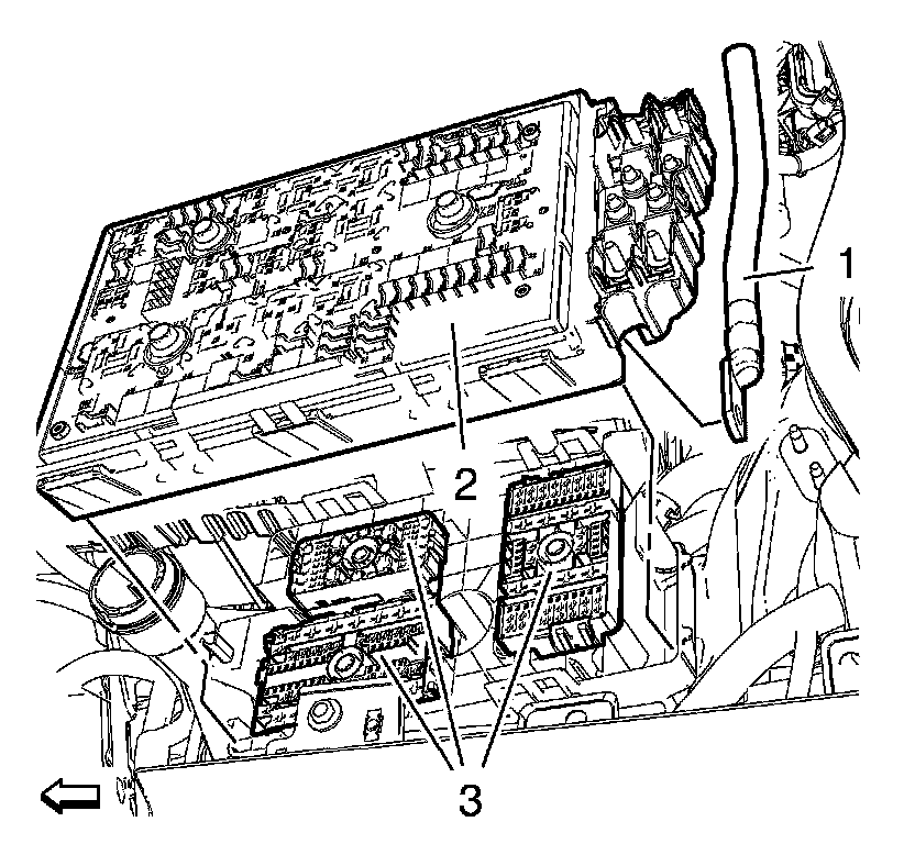 5. Unlock retaining tabs and remove the front compartment fuse block (3).