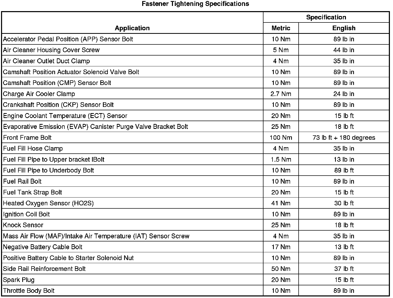 Fastener Tightening Specifications