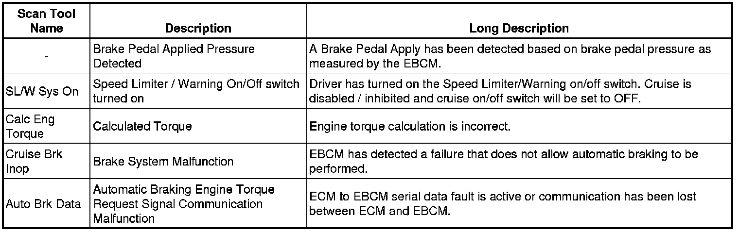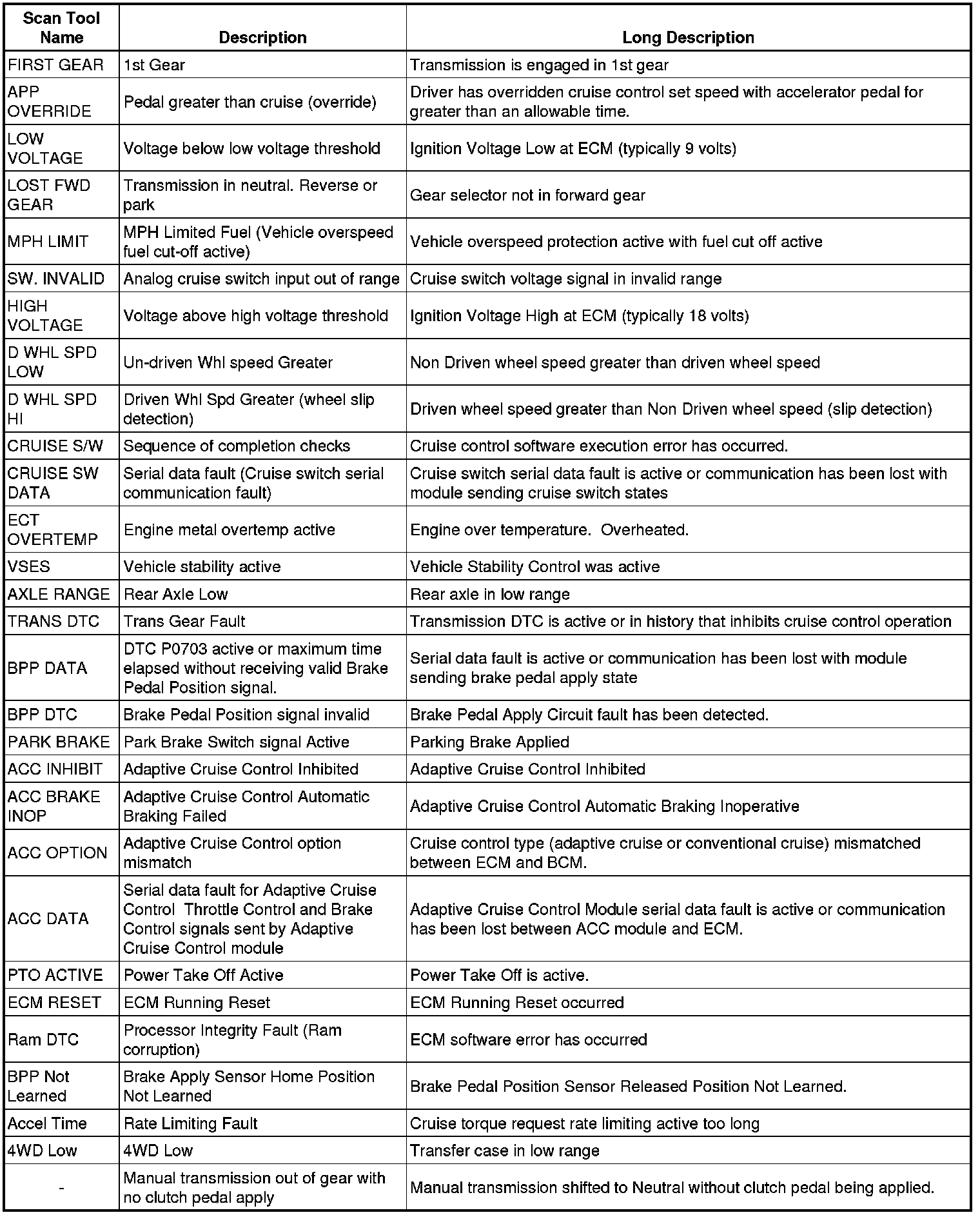 Every time the Cruise Control System is disengaged, the ECM will keep track of the reason for system disengagement. The last 8 disengagement reasons will be recorded within the ECM memory. The scan tool will display the last 8 Cruise Disengage History parameters, in which one out of approximately 50 possible reasons will be displayed in each of these 8 parameters. For the disengagement reason to be displayed within the scan tool parameter the Cruise Control System is active and disengagement is requested.