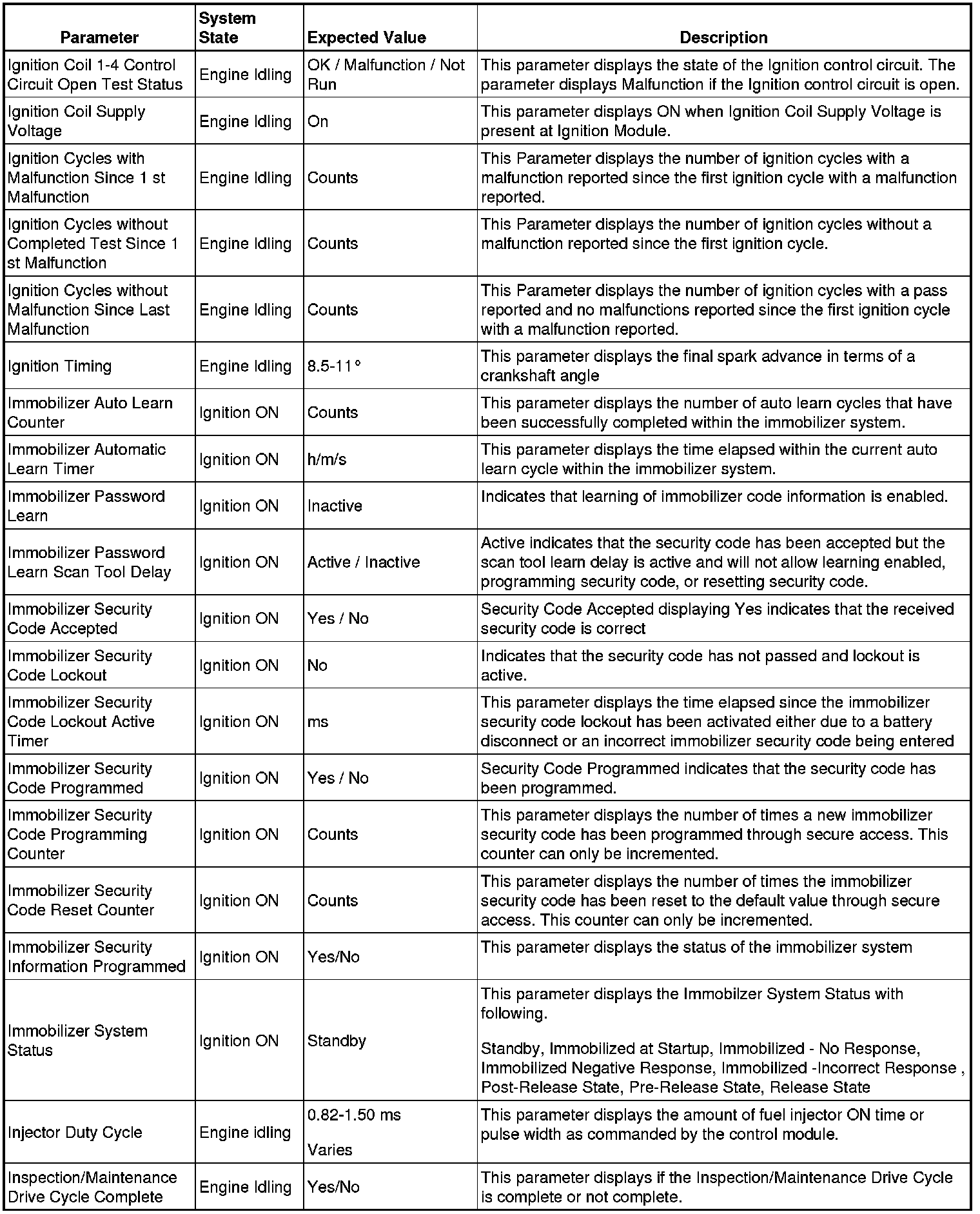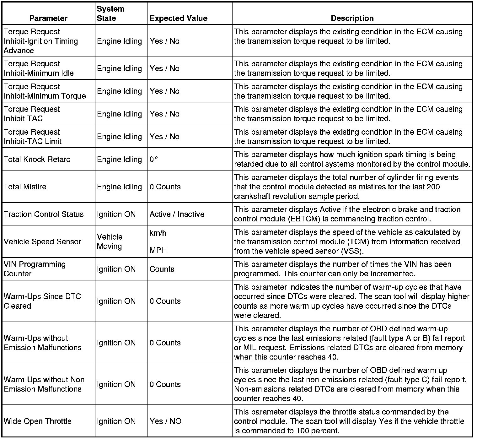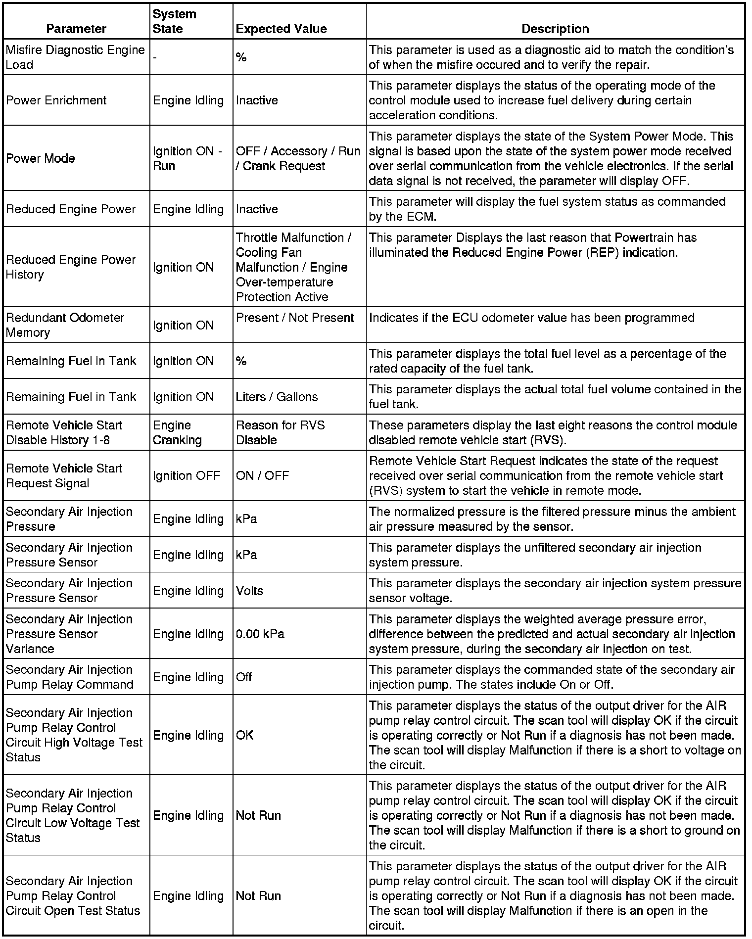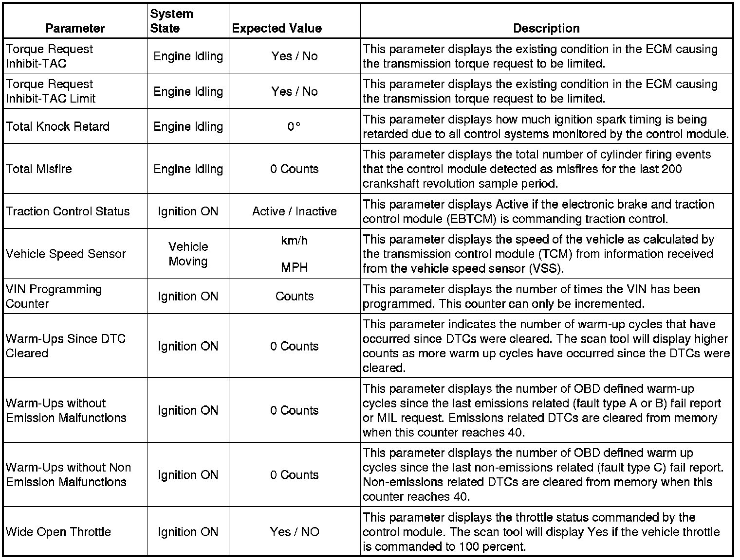 Only the parameters listed below are referenced in this service manual for use in diagnosis.