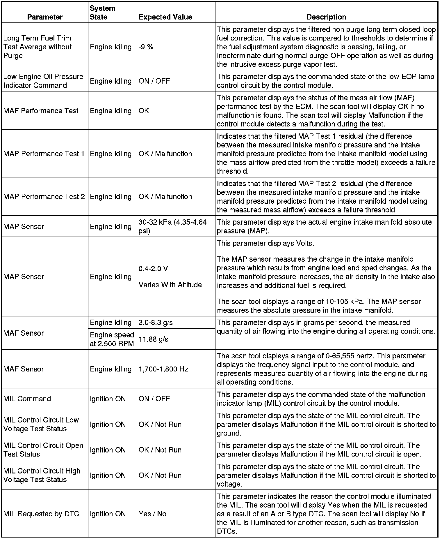 The scan tool values from a properly running engine may be used for comparison with the engine you are diagnosing. The Engine Scan Tool Data List represents values that would be seen on a normally running engine.