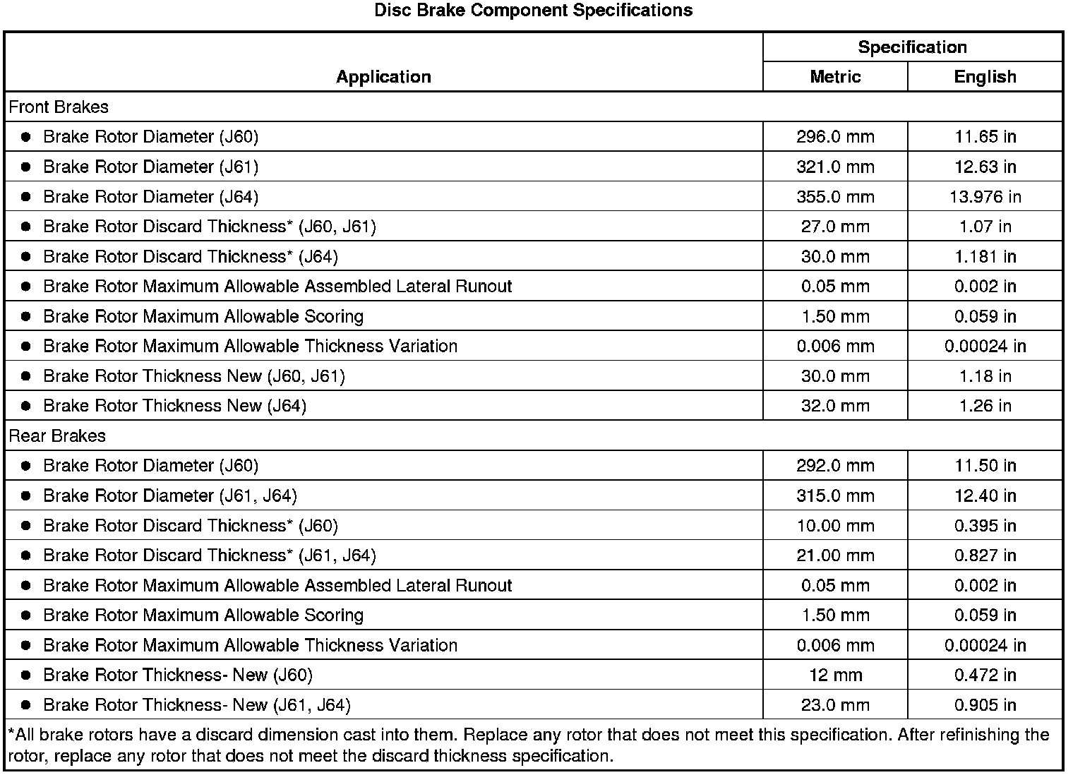 Disc Brake Component Specifications