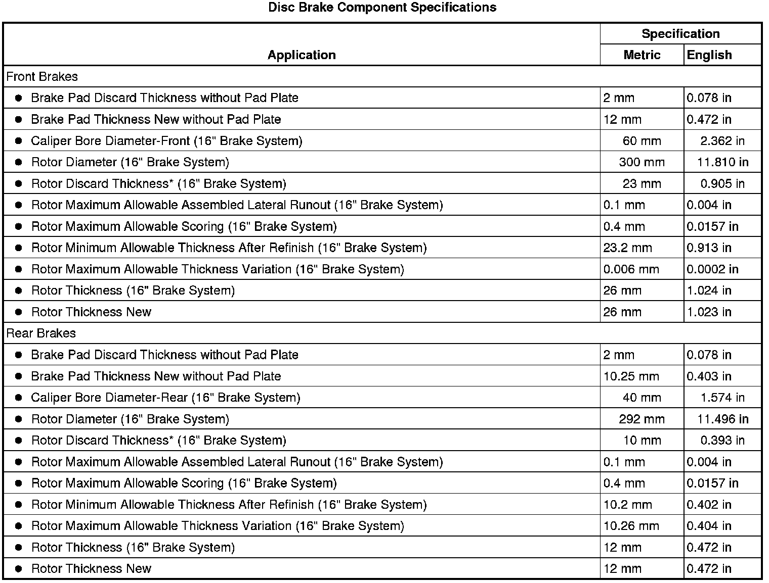 Disc Brake Component Specifications