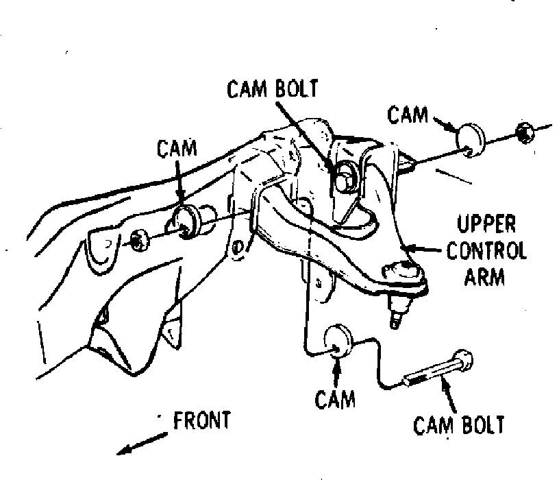 While holding cam bolt in position, loosen cam bolt nut, Fig. 2. Rotate cam bolt to obtain a change in camber equal to 1/2 the needed correction. Hold cam bolt in position and tighten cam bolt nut. To obtain the remaining 1/2 of needed correction apply the above procedure to the other cam bolt.