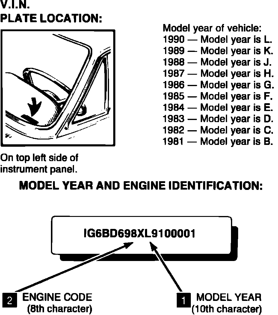 (1) MODEL YEAR IDENTIFICATION: Refer to illustration of Vehicle Identification Number (V.I.N.). This year is indicated by a code letter.