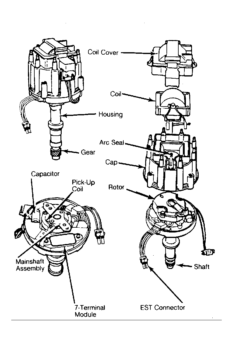 The distributor has neither vacuum nor centrifugal advance mechanisms. See Fig 1 and Fig 2 . The distributor contains a 7-terminal HEI-EST control module, a timer core, pick-up coil, radio noise suppression capacitor, and on most models, an integrally mounted ignition coil, located under the distributor cap's coil cover. Distributors on vehicles equipped with 2.5L VIN 2 and 2.5L VIN R engines also contain a Hall Effect switch and shutter blades.