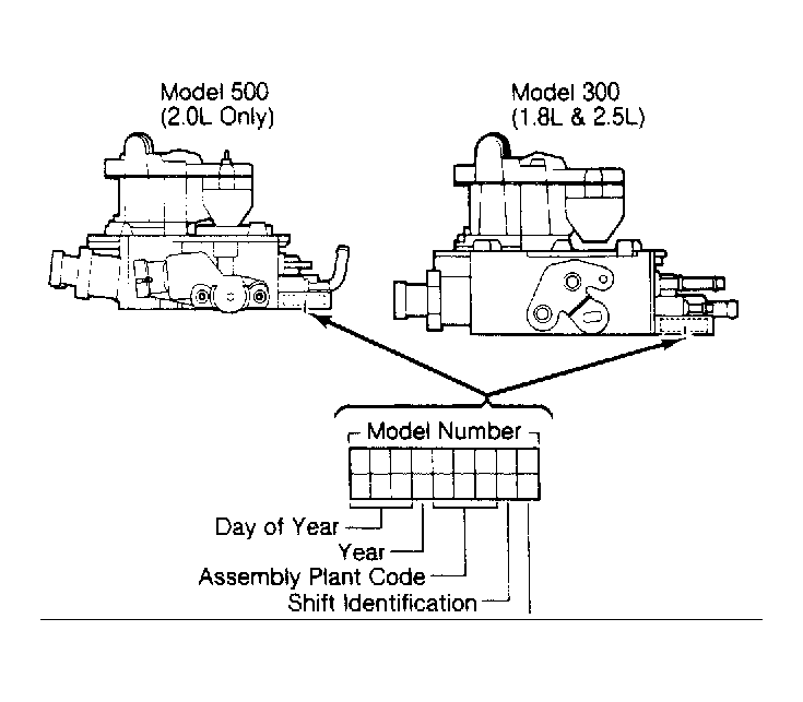 The throttle body identification number is "roll-stamped" on the front mounting flange on the throttle lever side (Model 300) or throttle position sensor side (Model 500) of the throttle body. See Fig 1 . Alphabetical code letters are stamped on the throttle body at external tube locations to identify vacuum hose connections.