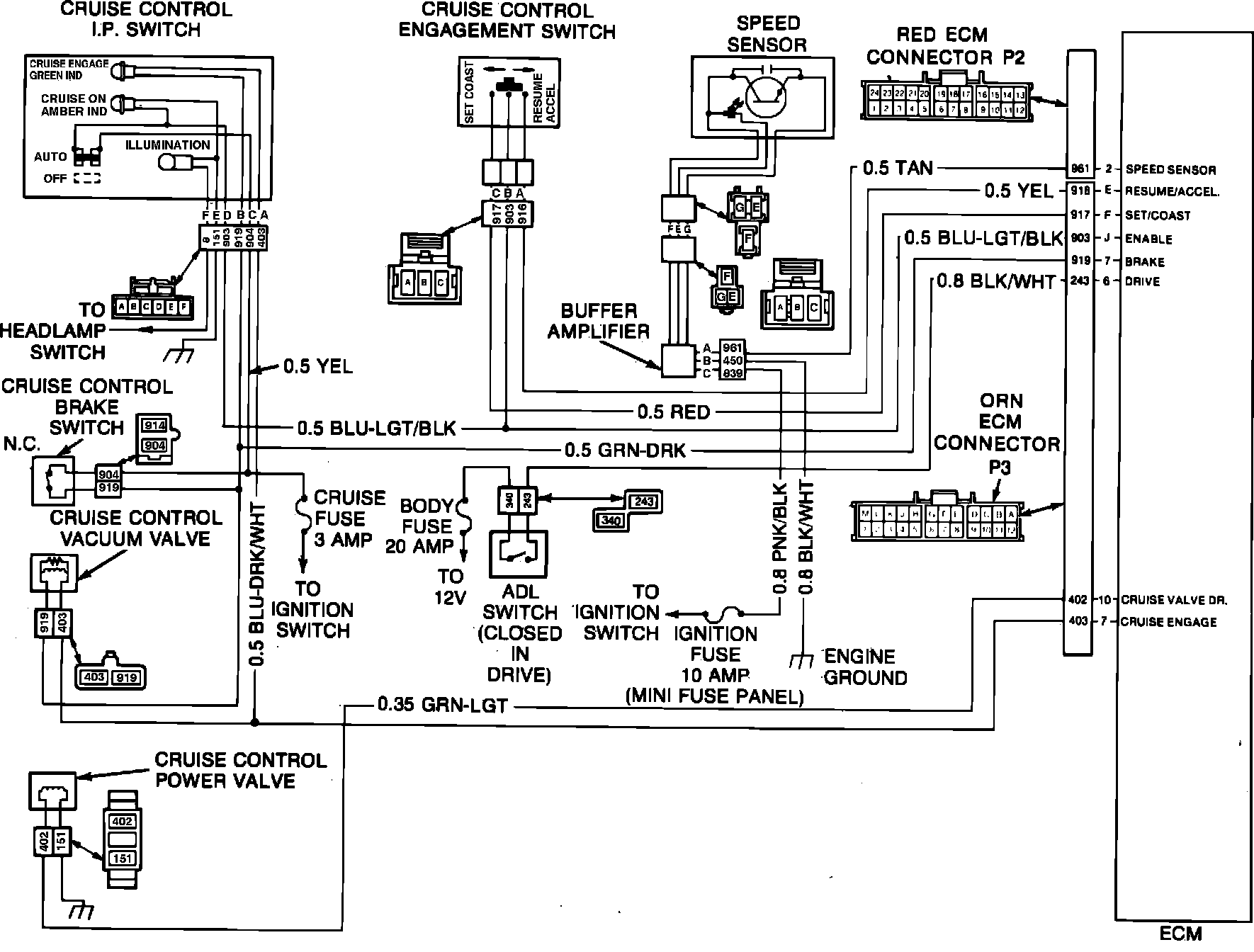 2. If reading at pin F is 12 volts, disconnect orange connector at ECM and check voltage at pin F. If reading remains at 12 volts, check for short in power feed of circuit 84. If circuit is satisfactory, replace set/coast switch. If voltage at pin F is zero volts, ECM or ECM connector is at fault.