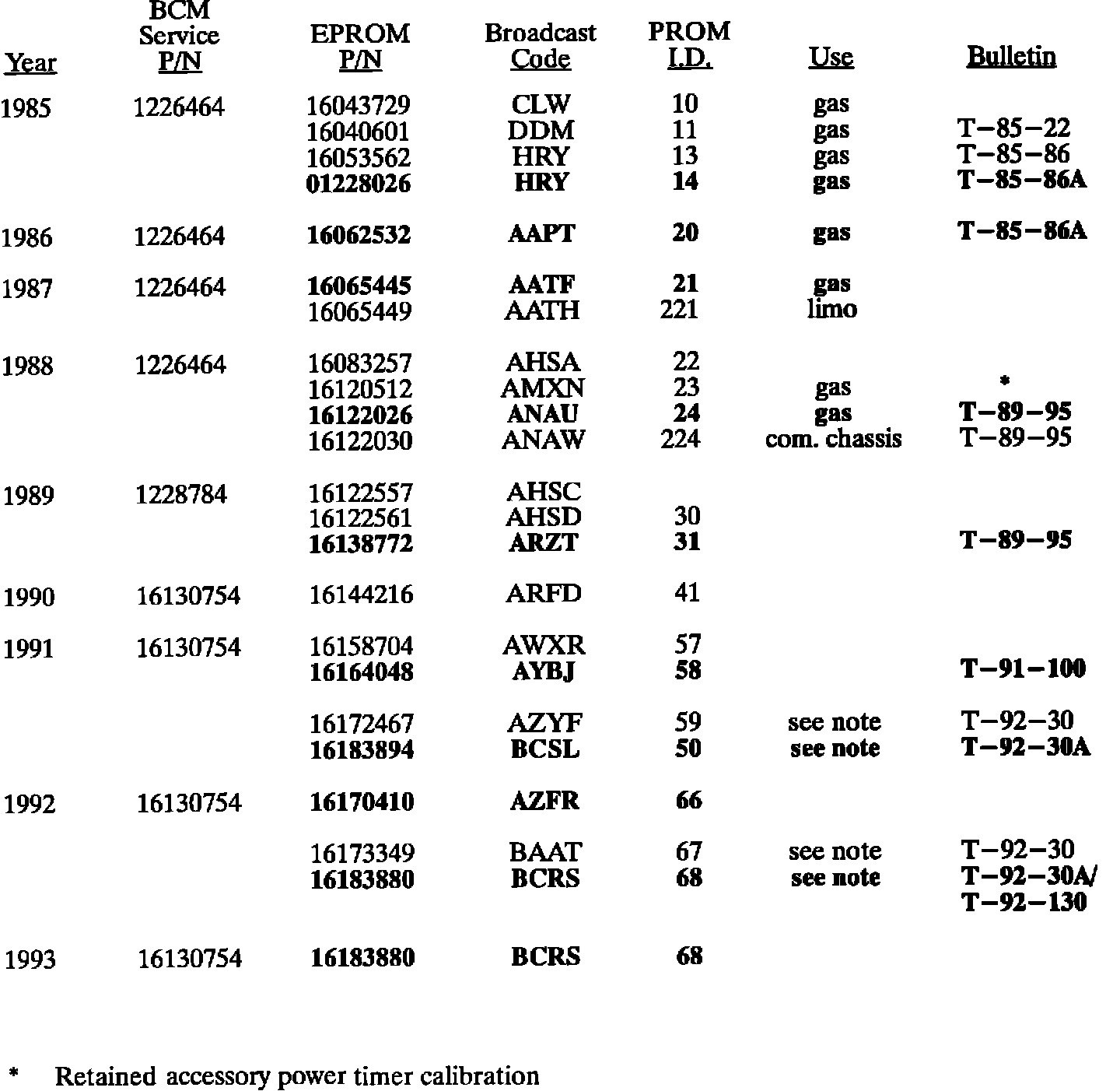 The charts summarize all of the EPROM calibrations made on 1985-1993 BCM equipped vehicles to date. When any diagnosis leads to BCM EPROM replacement, the latest service EPROM part number listed should be used. Should any additional EPROM calibration changes be made, the GMSPO parts distribution system will automatically supersede these service part numbers.