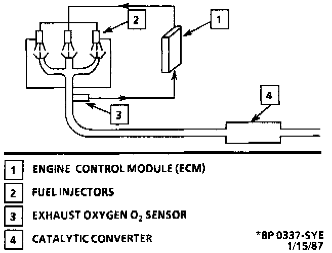 The specific values for the above conditions vary with different engines, and are stored in the memory calibrator (Mem-Cal) portion of the ECM. When these values are met, the system goes into "Closed Loop" operation. In "Closed Loop," the ECM calculates the air/fuel ratio (injector "ON"-time) based on the signal from the O2 sensor. This allows the air/fuel ratio to stay very close to 14.7:1.