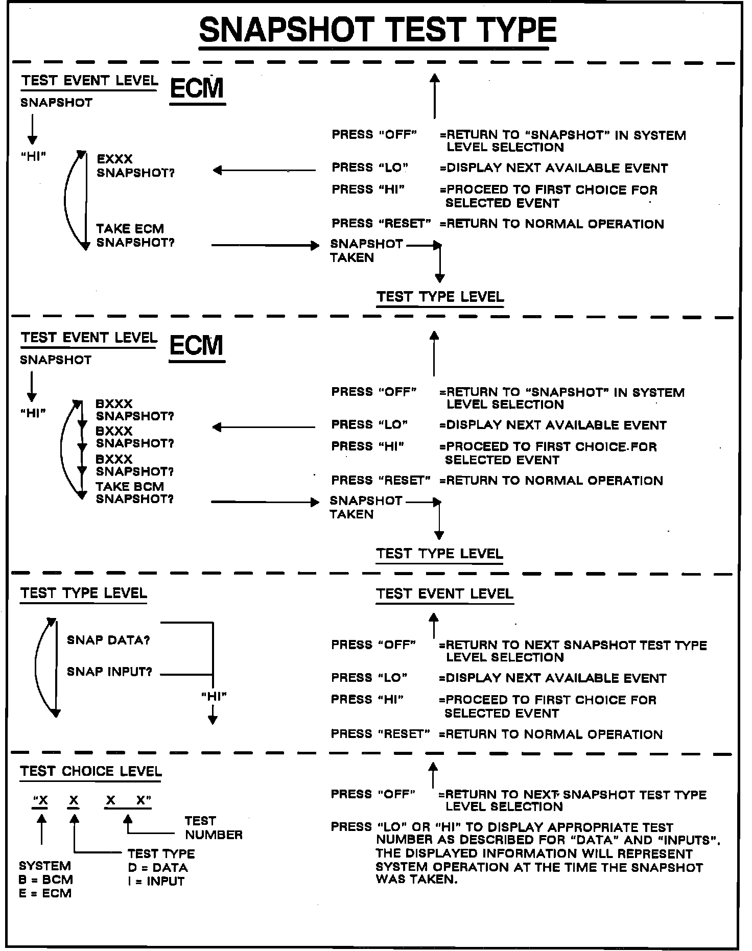 The display will then be controlled as for normal data and input displays, however, all values and status information will represent memorized vehicle conditions. Depressing the Hi button with ``Snapshot?'' displayed will display ``Snapshot Taken,'' indicating that new information has been stored in the memory.