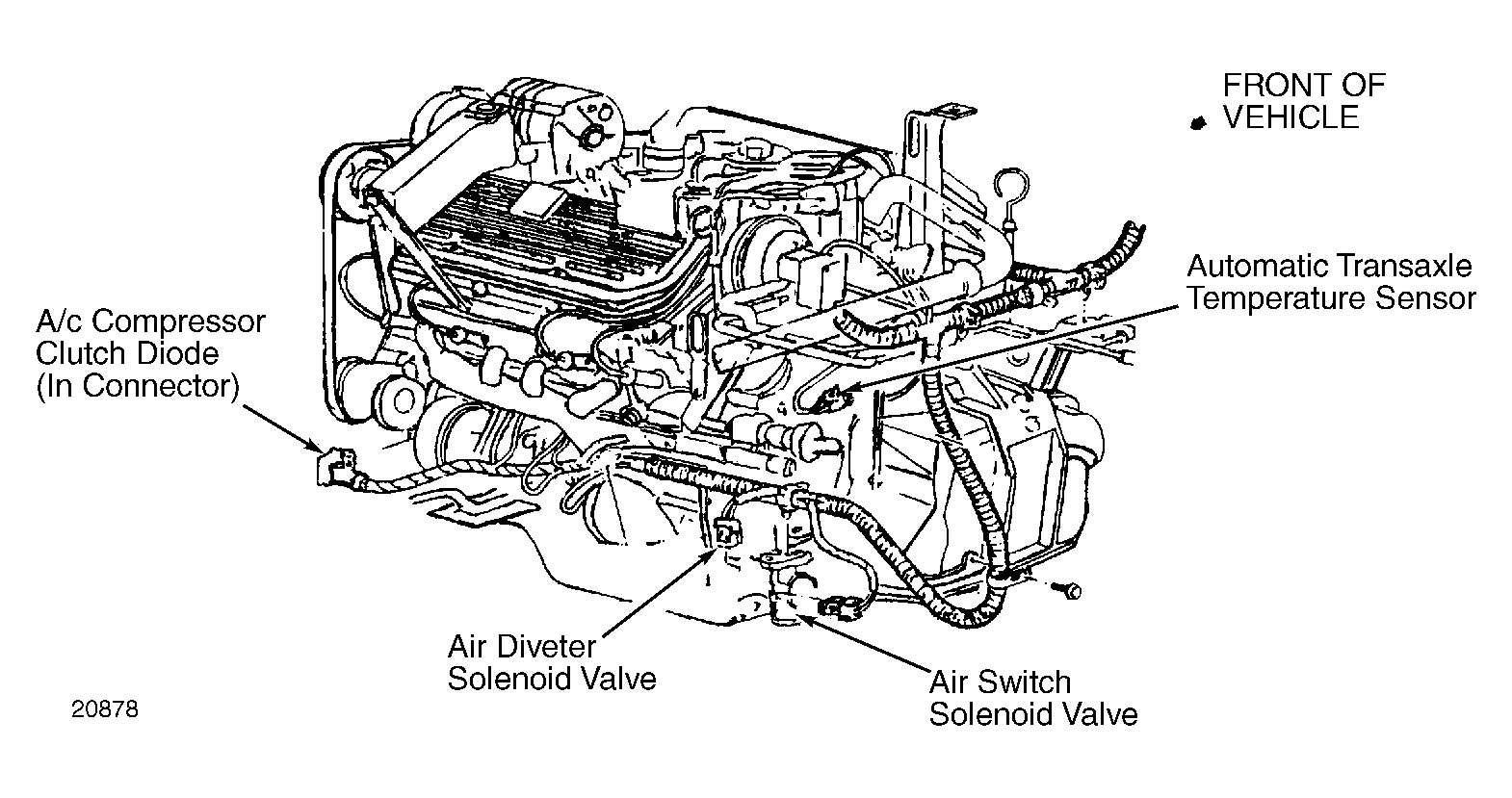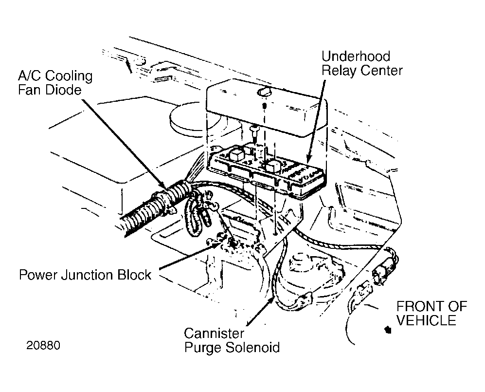 | A/C Cooling Fan Diode | In wiring harness below underhood relay center. See Figure. |
