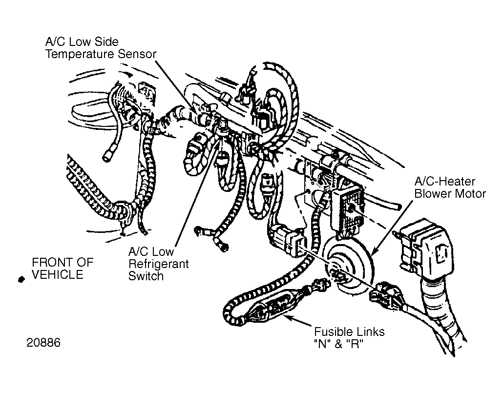 | Fusible Link N & R (Orange) A/C Blower Motor | At center of firewall in engine compartment, at blower motor. See Figure. |