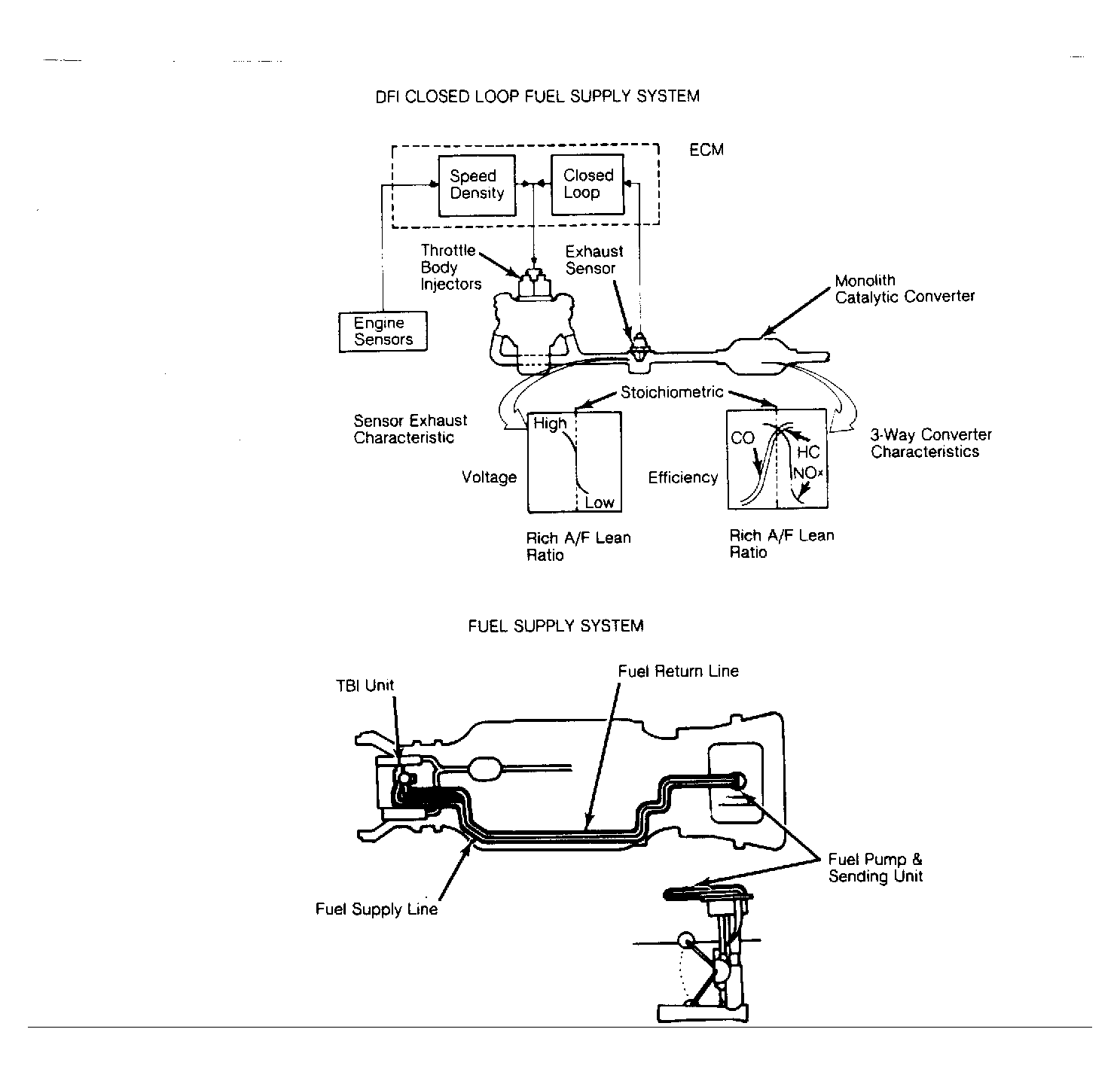 The fuel pressure regulator is an integral part of the throttle body, and provides pressurized fuel at up to 20 psi. A diaphragm-operated relief valve regulates fuel pressure. Relief valve is exposed to atmospheric pressure on bottom side and top side, and senses fuel pressure to maintain constant pressure between 9 and 12 psi across fuel injectors. Unused fuel is returned to fuel tank through fuel return line.