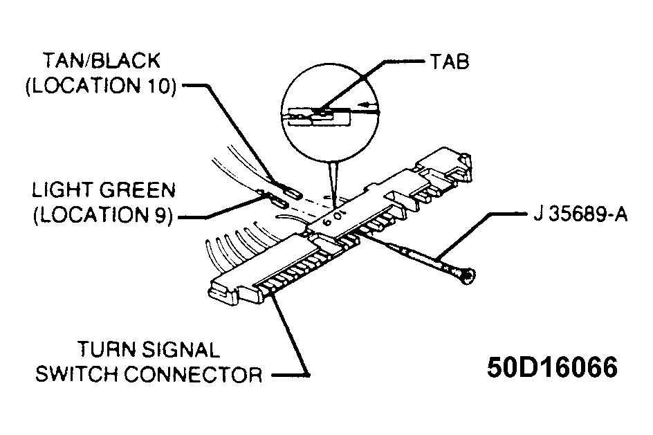 - Tan/Black wire to Location 10NOTE: Wire terminal retainer must be removed and discarded from service buzzer switch wire.