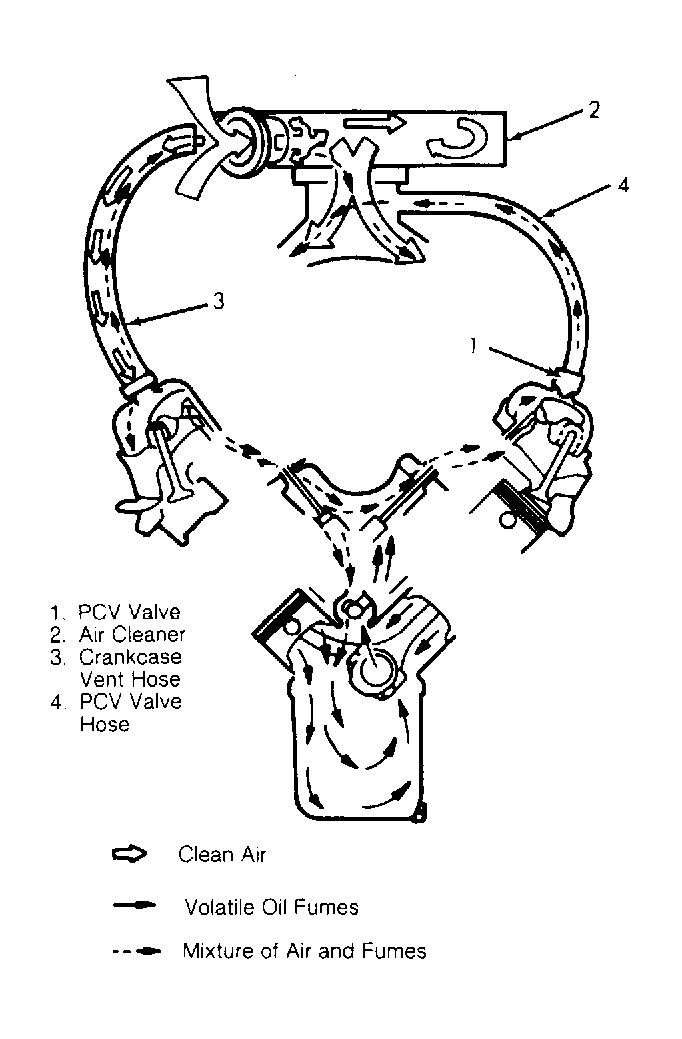 Under conditions where abnormal amounts of blow-by gases are produced (such as worn cylinders or rings), the system is designed to allow the excess gases to flow back through crankcase vent hose into the air inlet and be consumed during normal combustion. See Fig 1 .