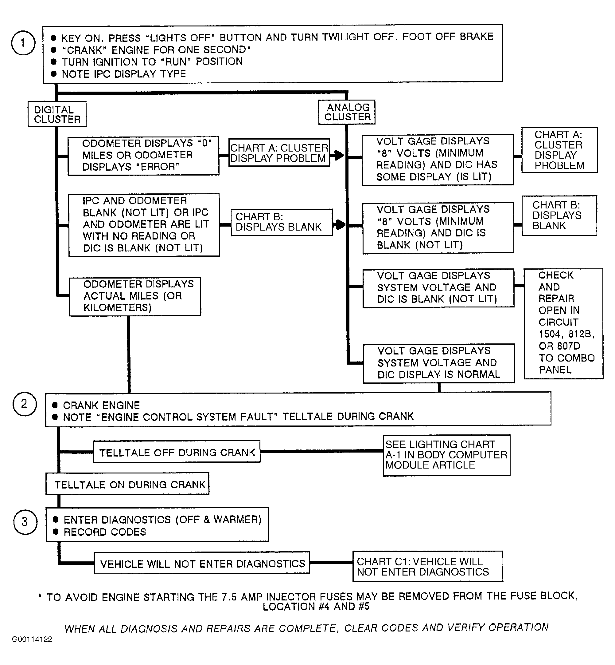 - The odometer displays and "Engine Control System Fault" lamp work. Enter diagnostics and continue with code diagnosis. If diagnostics cannot be entered, refer to CHART C-1: VEHICLE WILL NOT ENTER DIAGNOSTICS . Is there a trouble code displayed? If a trouble code is identified using the self-diagnostics, a problem has been detected by the system which can be corrected following the appropriately numbered code chart.