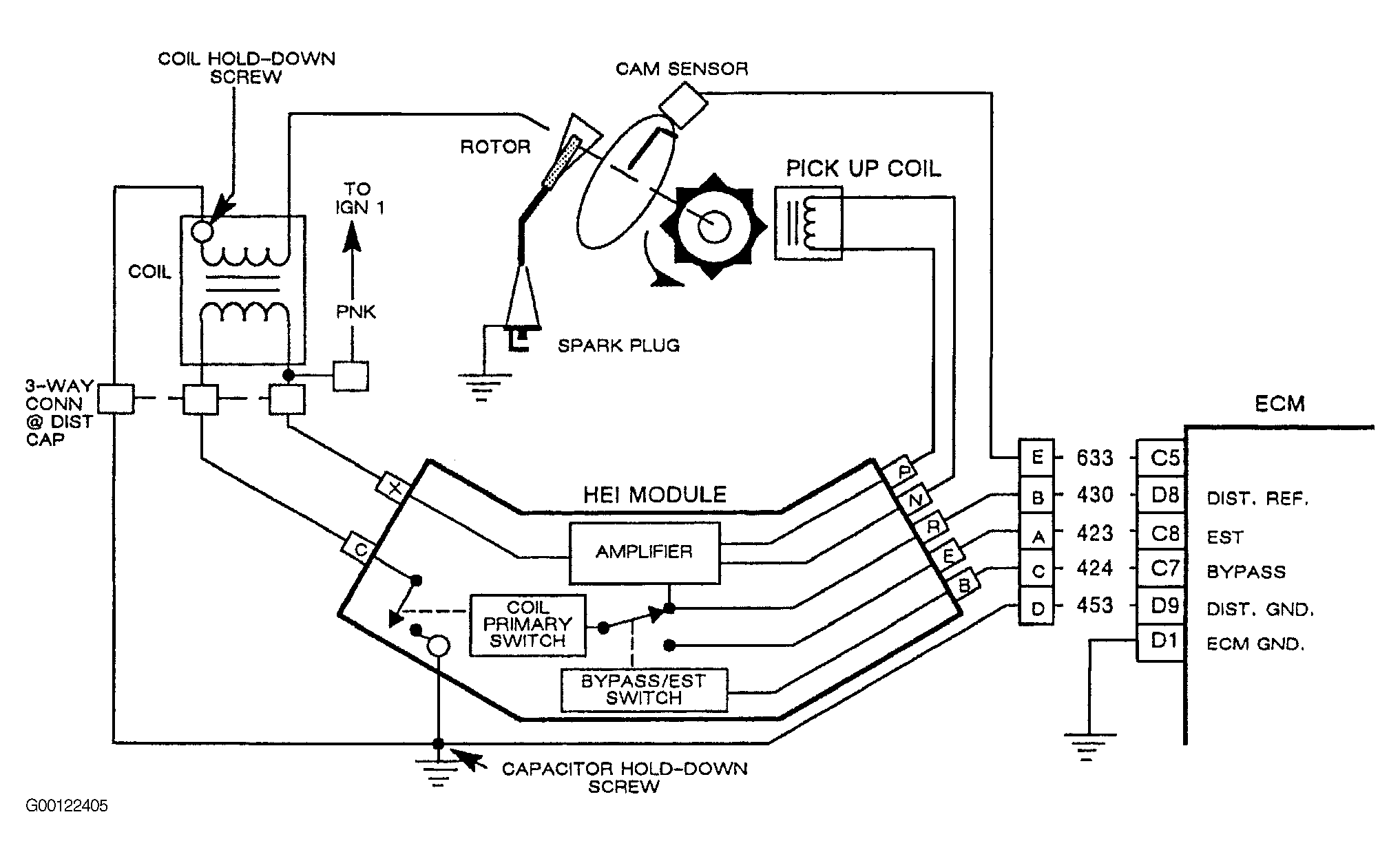 This is the ground circuit for the distributor reference signal. This is the low voltage reference for the distributor reference signal. High resistance or an open in this circuit will prevent the PCM from receiving a clean signal from the HEI module.