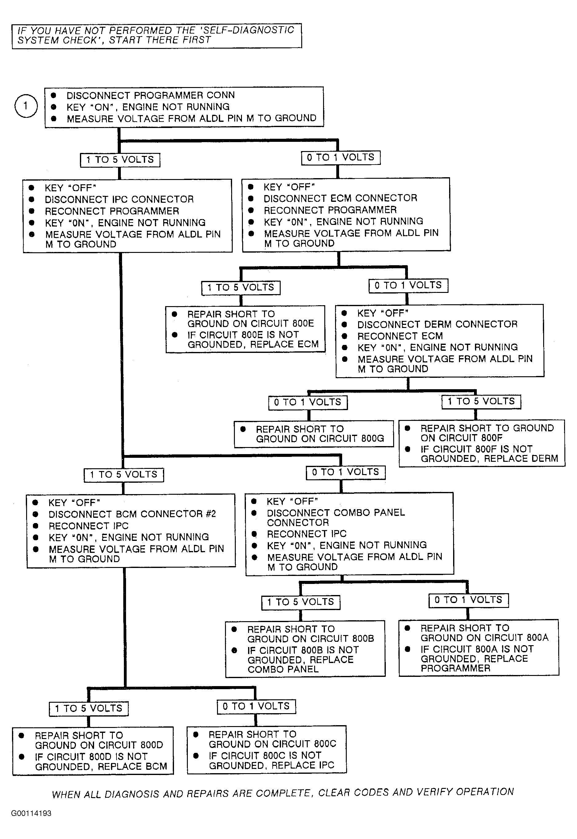 You have been directed to this chart from CHART D: DATA CIRCUIT PROBLEM because there is a short to ground on circuit 800. This chart will help you determine where the short circuit is located.