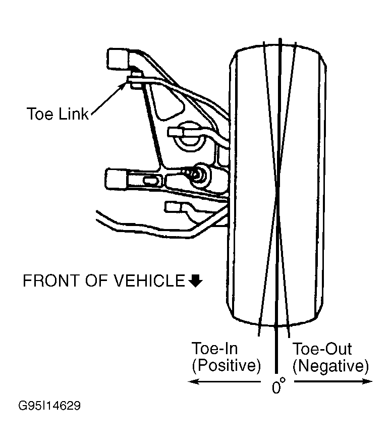 Loosen toe link bolt. See Fig 1 . Move wheel inward or outward as necessary until toe-in is as specified. See WHEEL ALIGNMENT SPECIFICATIONS . Tighten bolts to specification. See TORQUE SPECIFICATIONS.