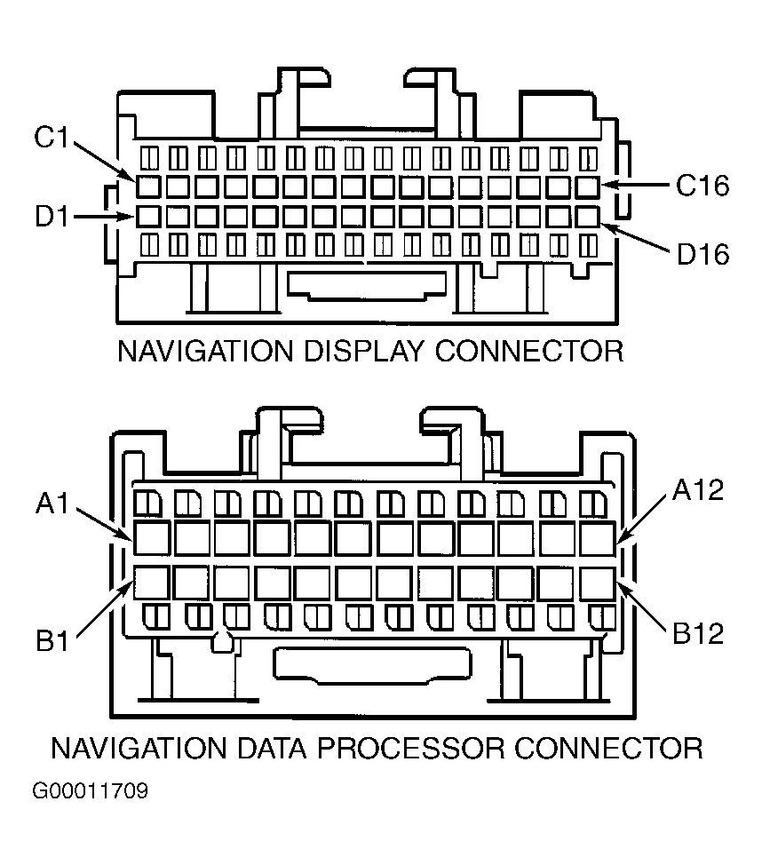 - Turn ignition off. Disconnect navigation data processor connector located in center of instrument panel, above IPM. See Figure