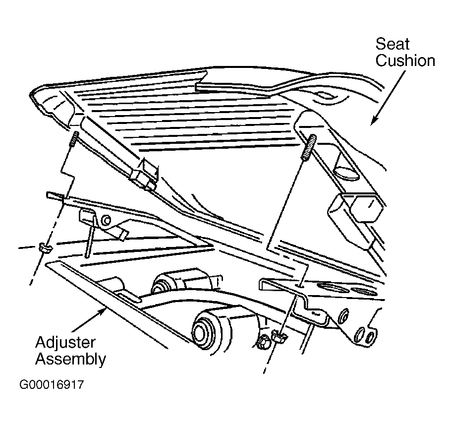 - Before proceeding, disable air bag system. See AIR BAG RESTRAINT SYSTEMS - DEVILLE, ELDORADO & SEVILLE article. If possible, adjust front seat to up position until maximum travel is reached. Angle front of seat cushion up to access seat cushion fasteners. Remove fasteners retaining cushion to seat adjuster. See Fig 1