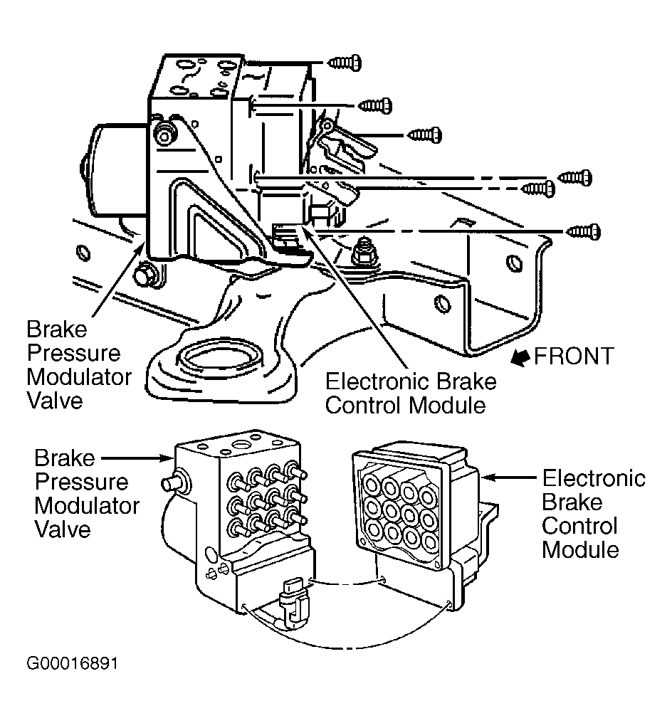 - Raise and support vehicle. Remove left front wheel and left front splash guard. Remove left air injection pump to gain access to Electronic Brake Control Module (EBCM). See Figure