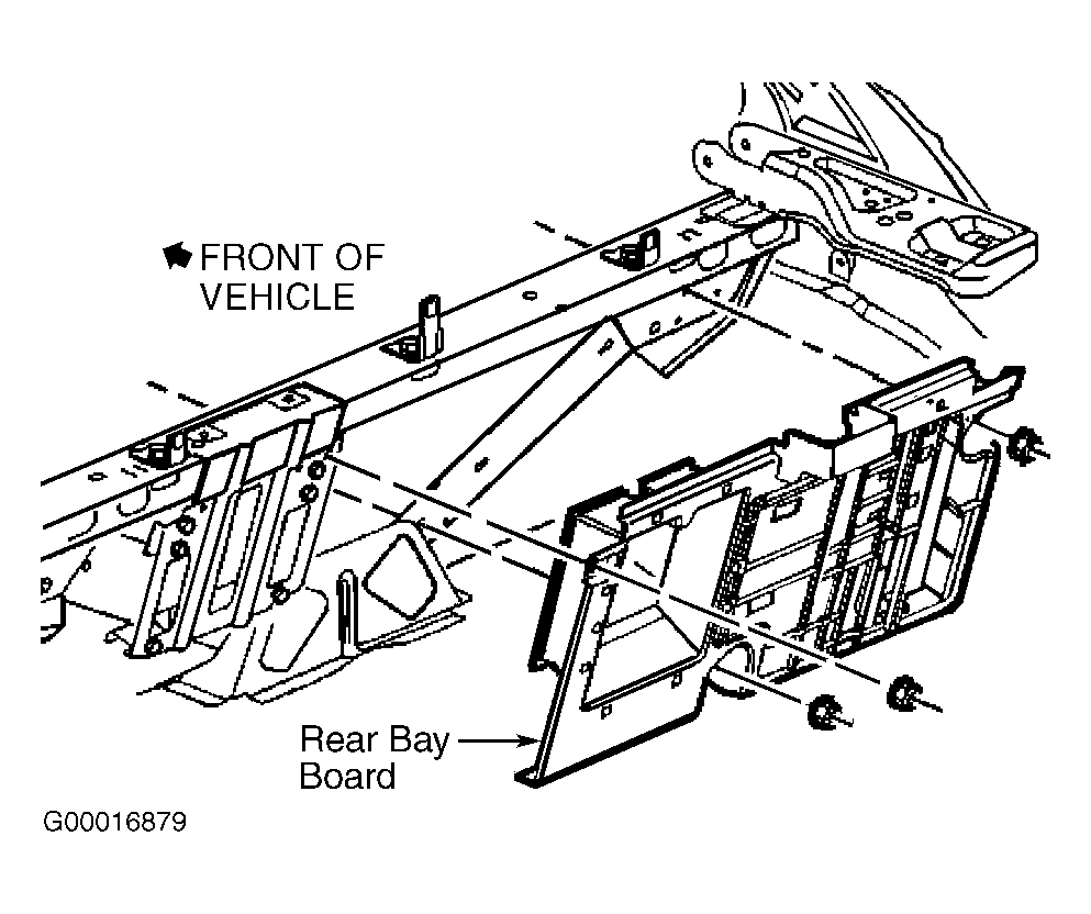 Disconnect negative battery cable. Remove rear compartment trim panel. See REAR COMPARTMENT TRIM PANEL . Remove bay board fasteners and pull bay board away from body. See Figure . Place bay board module side up in rear compartment. Disconnect electrical connections from Rear Integration Module (RIM). Remove fasteners retaining module to bay board and remove RIM. To install, reverse removal procedure.