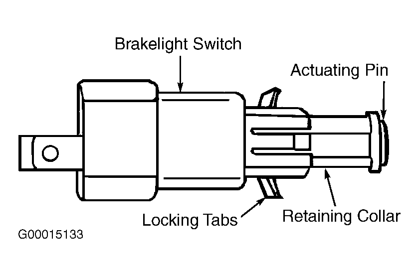 To install, pull actuating pin and retaining collar out of housing about 2/3" to fully extend actuating pin. See Figure . Connect stoplamp switch harness connector. Pull up on brake pedal to ease installation of stoplamp switch. Insert stoplamp switch into bracket until switch locking tabs snap securely in place. Release brake pedal and allow it to settle to non-applied position. This will adjust actuator pin to proper position. Install floor outlet duct and insulator panel.