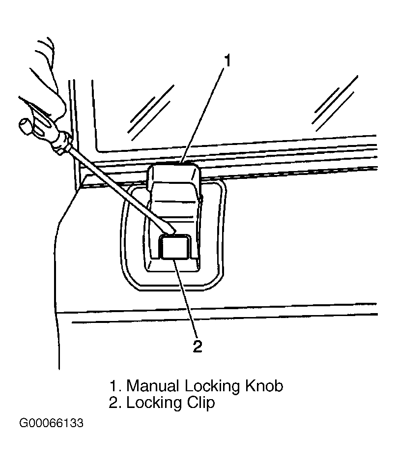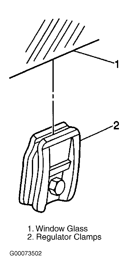 - Carefully raise window regulator clamps (2) to full up position, engaging window (1). Remove tape from window. See Fig 3