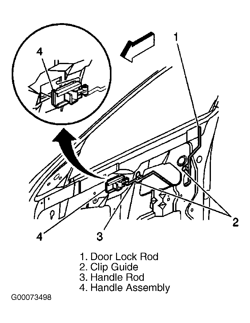 - Position rear of inside handle assembly (4) into opening of inner panel. Press front of assembly (4) inward until it fully engages inner panel. See Fig 1