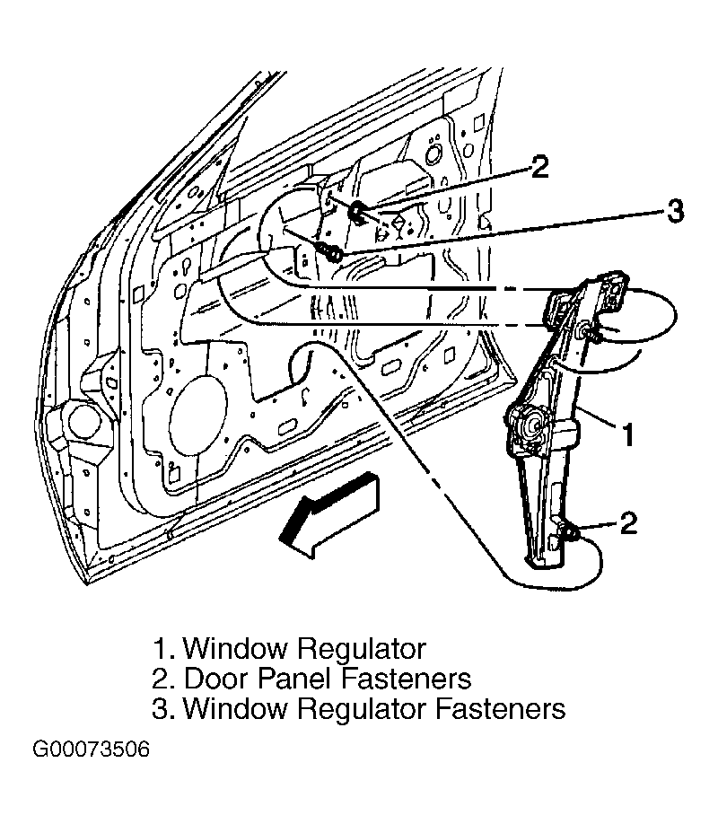 - Install window regulator (1) through access hole of inner door panel. Install window regulator fasteners (2, 3). See Fig 4