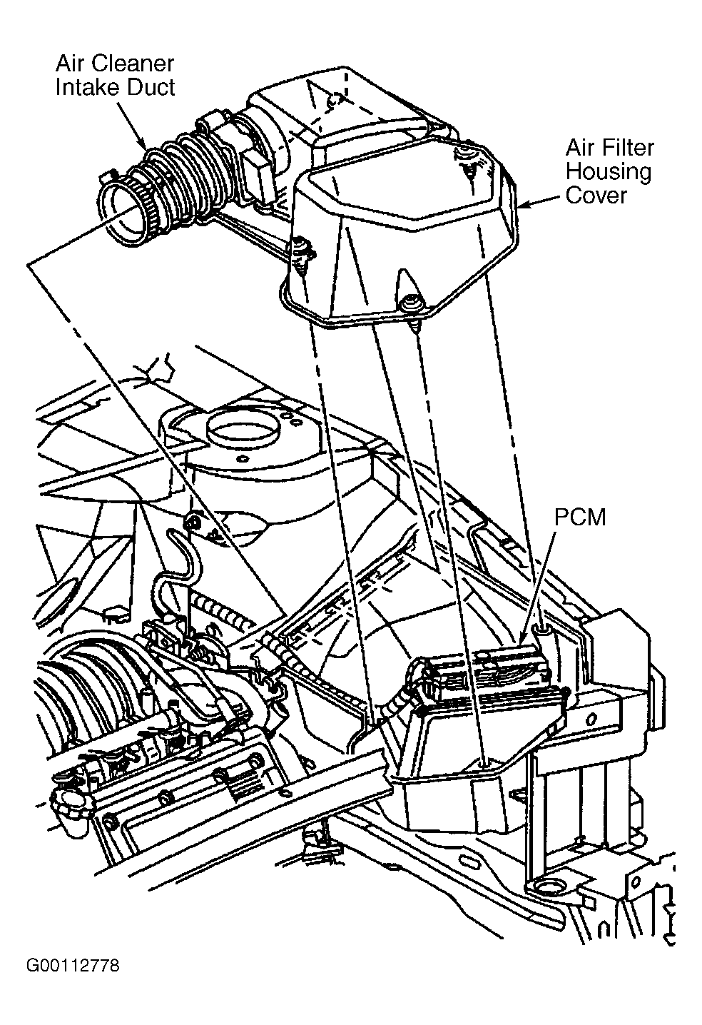 Powertrain Control Module (PCM) is located in front left side of the engine compartment, below the air cleaner. See Fig 1.