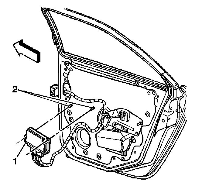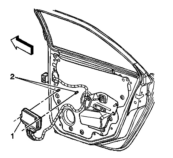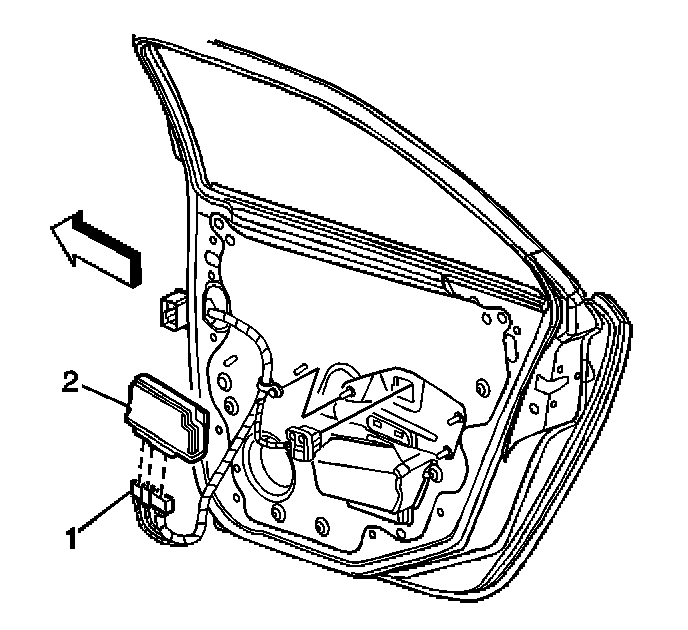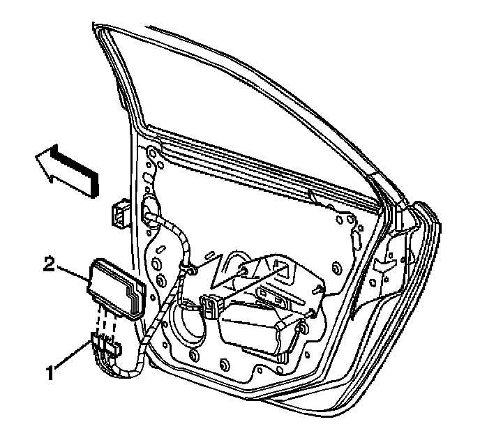 2. Remove the door control module (1) by releasing the retainer tabs (2).