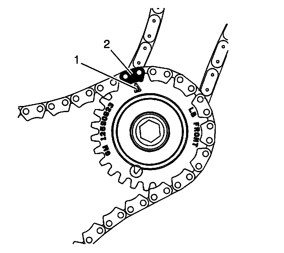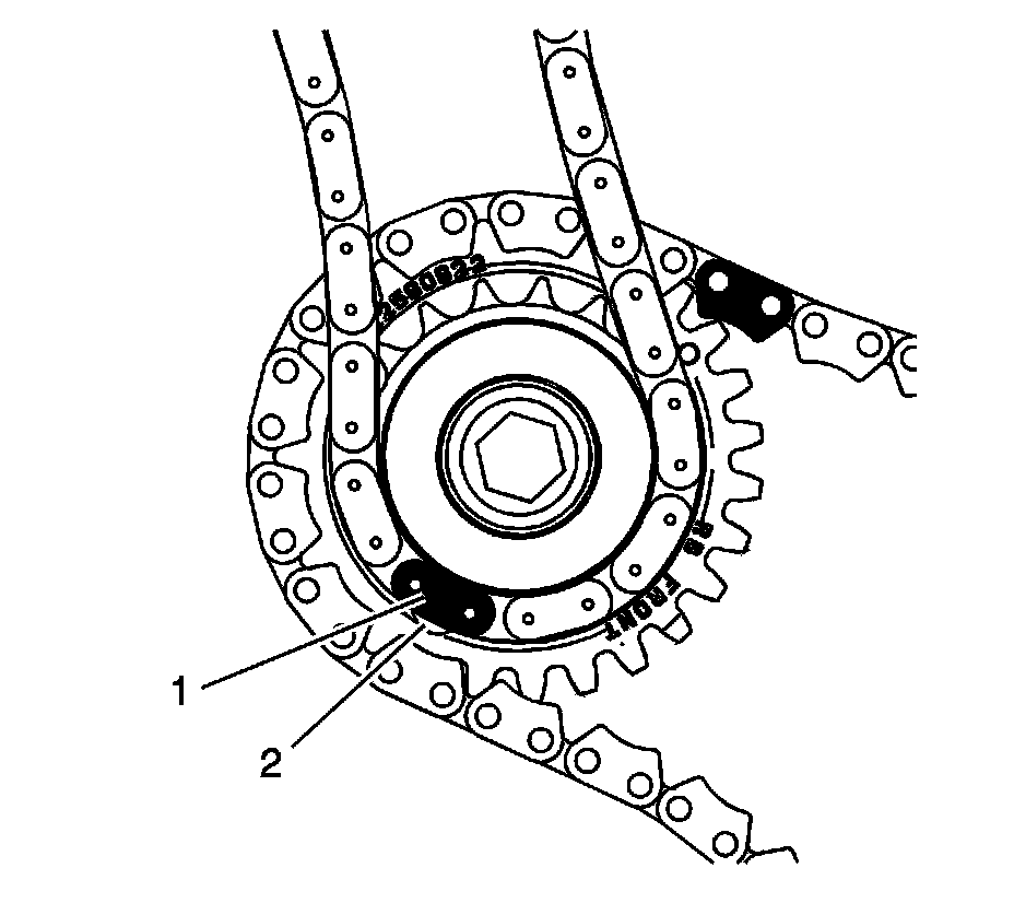 5. The crankshaft sprocket timing mark (2) will align with a timing camshaft drive chain link (1).