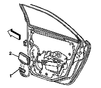 2. Remove the door control module (1) by releasing the retainer tabs (2).