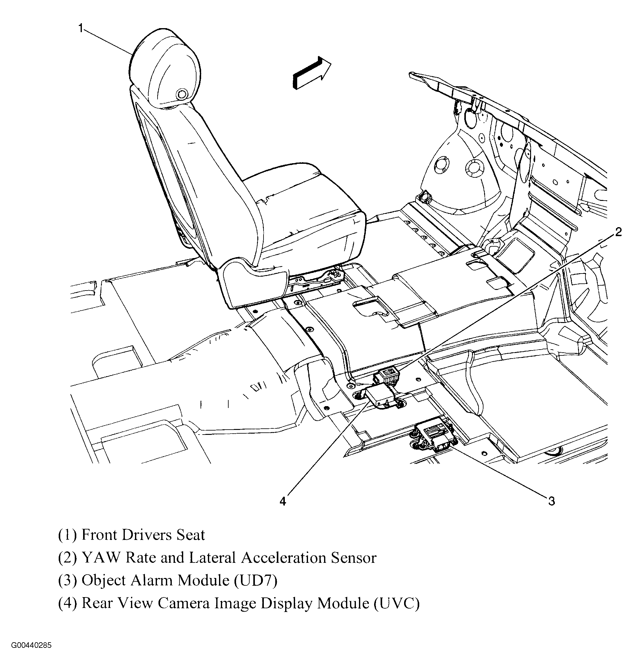 | Object Alarm Module | Under right front seat. See Figure. |