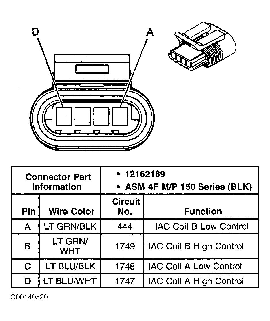 - Connect a test light between the IAC coil "A" low control circuit and IAC coil "A" high control circuit. See Fig 1 . Observe the IAC Counts parameter with a scan tool and test light. Using IAC motor driver, command high RPM until the IAC counts parameter starts to increment. Command low RPM until the IAC counts parameter starts to increment. Return the engine speed parameter to the desired idle speed parameter. Repeat procedure with test light connected between the IAC coil "B" low control circuit and IAC coil "B" high control circuit. Did the test light stay illuminated, never flashing, while the IAC counts were incrementing? If yes, go to next step. If no, go to step 17 .