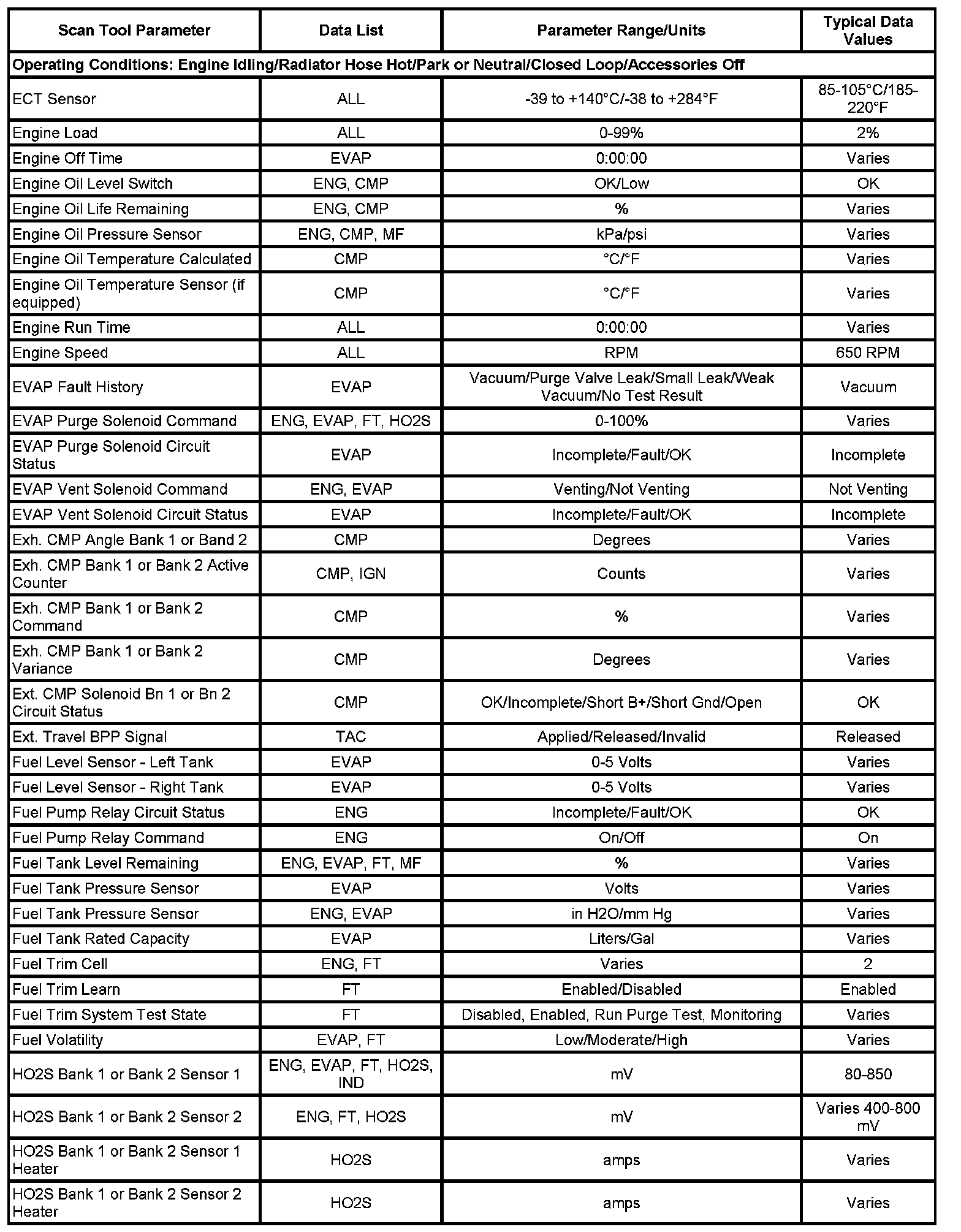The Engine Scan Tool Data List contains all engine related parameters that are available on the scan tool. The list is arranged in alphabetical order. A parameter may appear in any one of the data lists, and in some cases may appear more than once, or in more than one data list in order to group certain related parameters together.