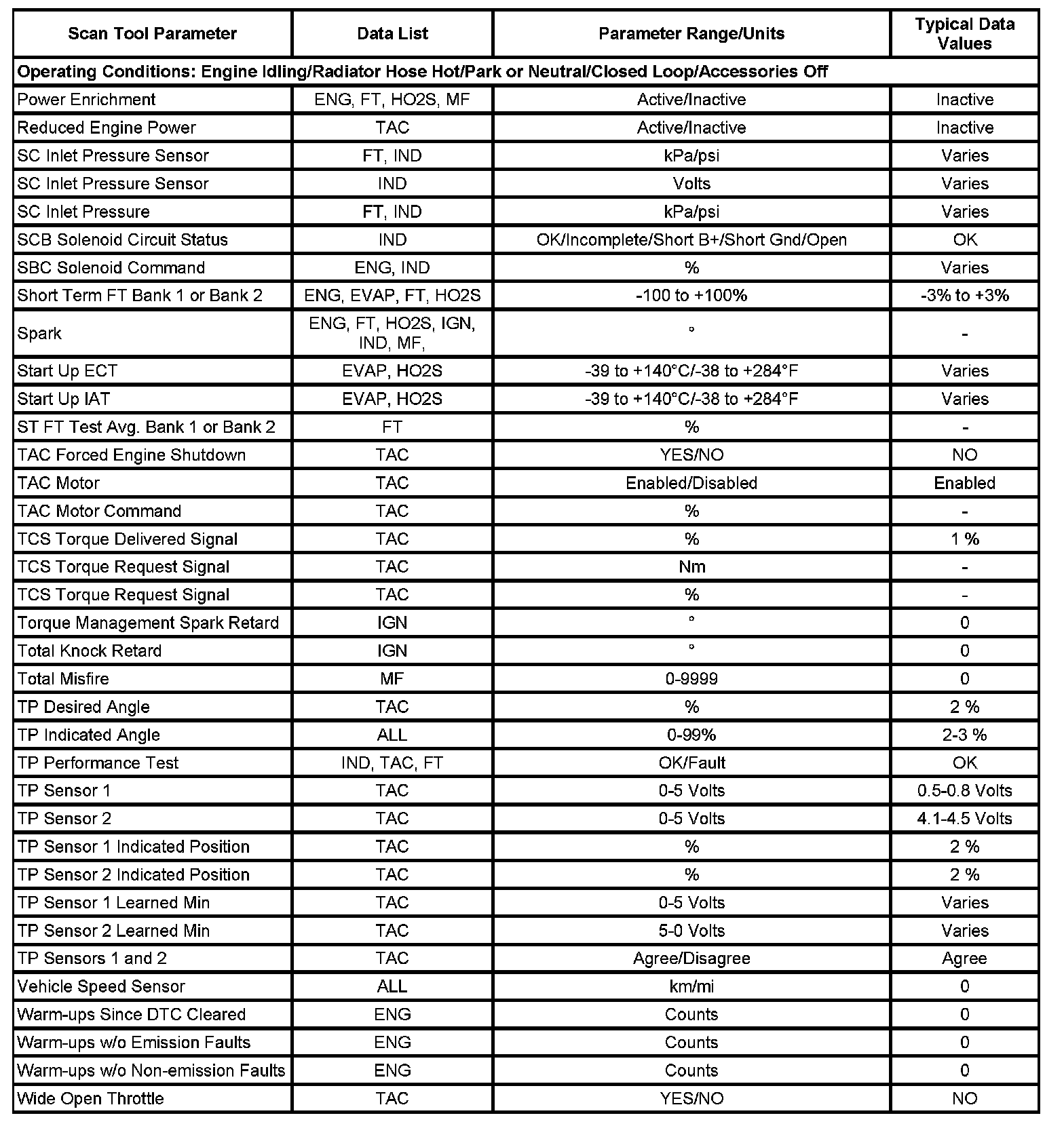 Scan tool values from a properly running engine may be used for comparison with the engine you are diagnosing. The Engine Scan Tool Data List represents the values that would be seen on a normal running engine.