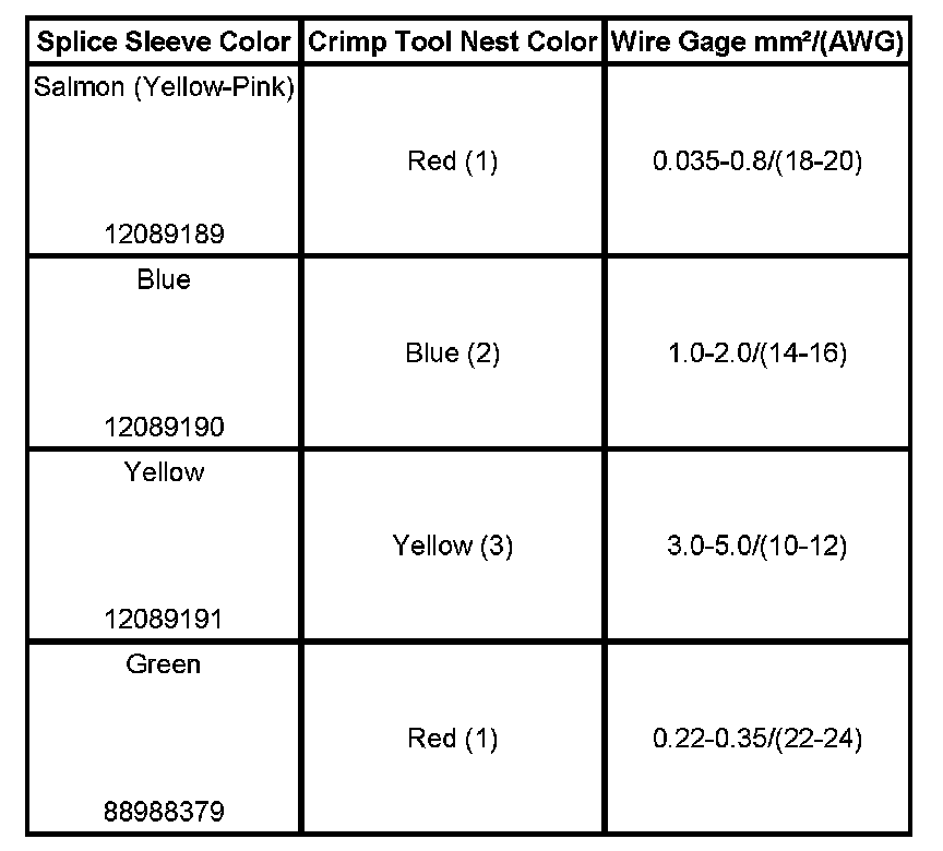 4. Select the proper DuraSeal splice sleeve according to the wire size. Refer to the above table at the beginning of the repair procedure for the color coding of the DuraSeal splice sleeves and the crimp tool nests.