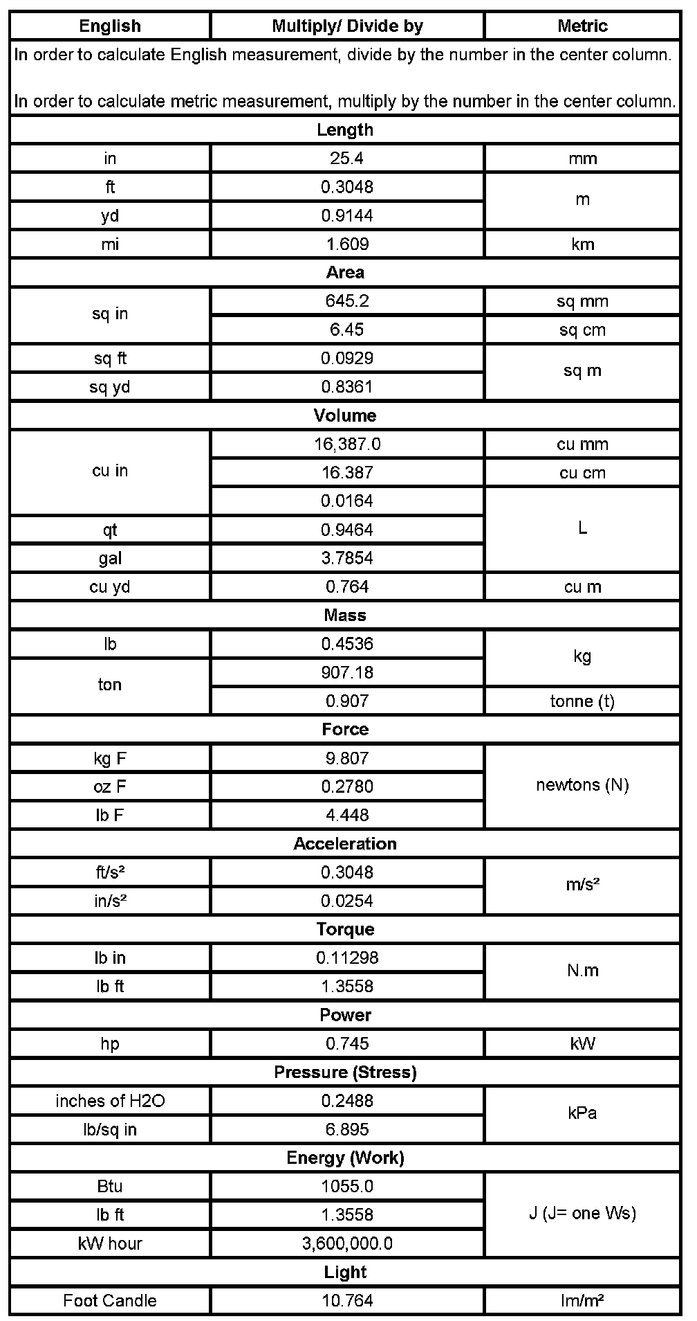 US English/Metric Conversion