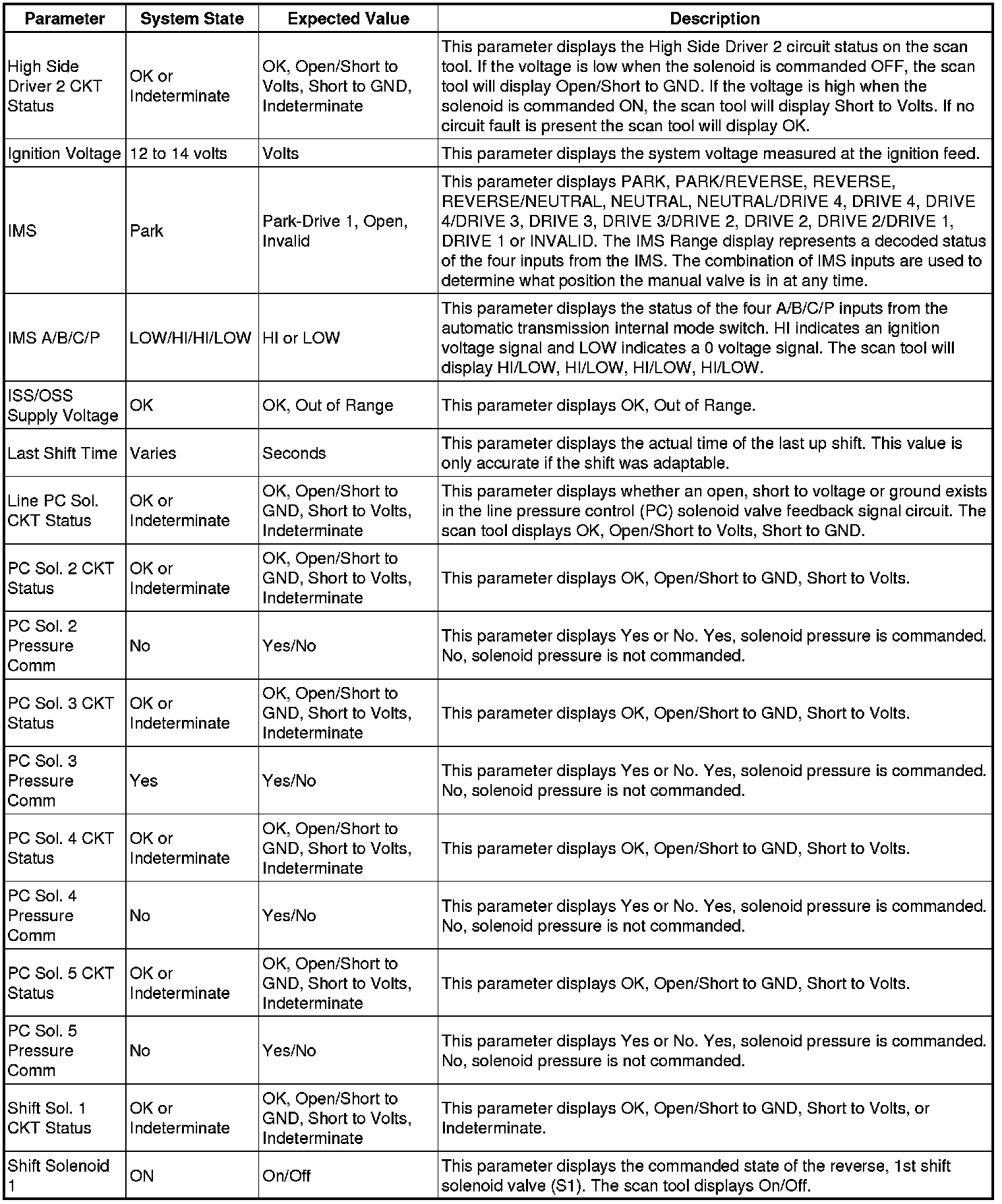 The scan tool values from a properly functioning transmission may be used for comparison with the transmission you are diagnosing. The values below represent a typical display recorded from a properly functioning system.