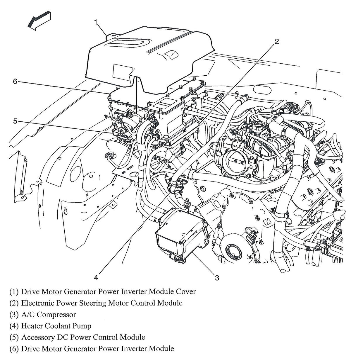 | Drive Motor Generator Power Inverter Module | Right side of engine compartment. See Figure. |