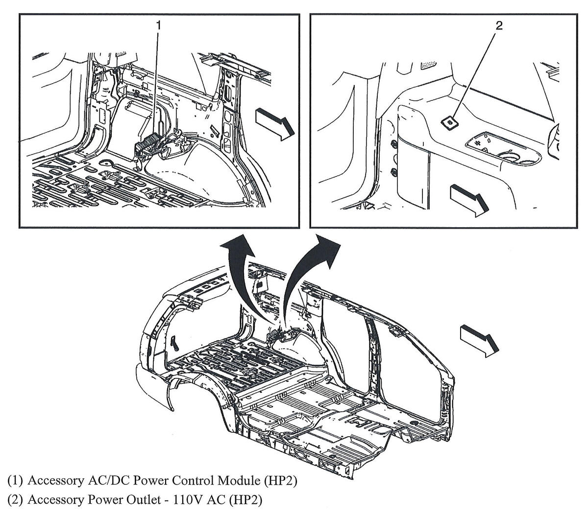 | Accessory AC/DC Power Control Module | Behind left rear quarterpanel. See Figure. |