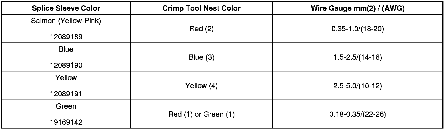 5. Select the proper Dura Seal splice sleeve according to the wire size. Refer to the above table at the beginning of the repair procedure for the color coding of the Dura Seal splice sleeves and the crimp tool nests.