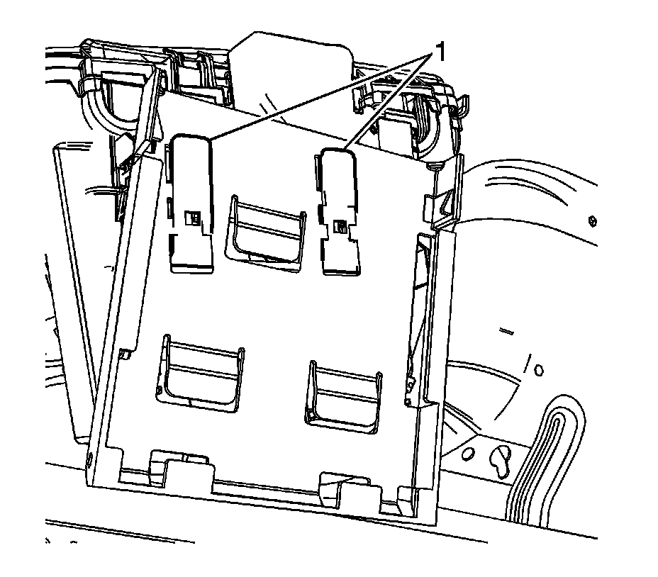 6. Using a small flat-bladed tool, depress the locking tabs (1) on the ECM bracket.